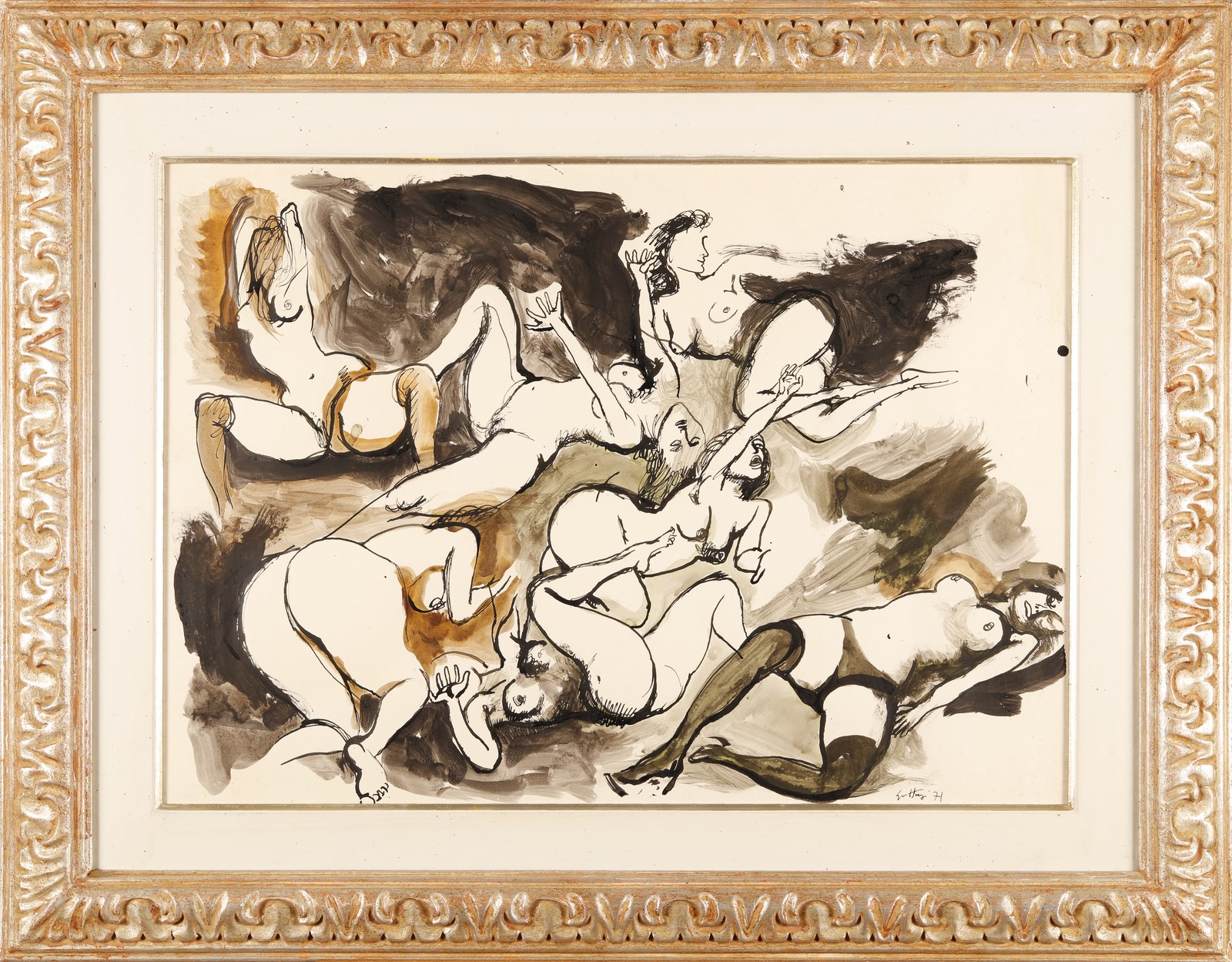 GUTTUSO RENATO (1912 - 1987) Baccanale. 1971. Tecnica mista su carta. Cm 70,00 x 50,00. Firma e anno in basso a destra. Al retro cartiglio descrittivo e timbro Galleria La Tavolozza, Palermo; Cartiglio Galleria La Scaletta. Autentica dell'artista su fotografia. Provenienza: Galleria La Scaletta, S.Polo di Reggio Emilia. Galleria La Tavolozza, Palermo. Opera archiviata presso l'Archivio Guttuso, Roma come da documentazione fotografica allegata all'opera riportante il relativo numero d'inventario. Cornice presente