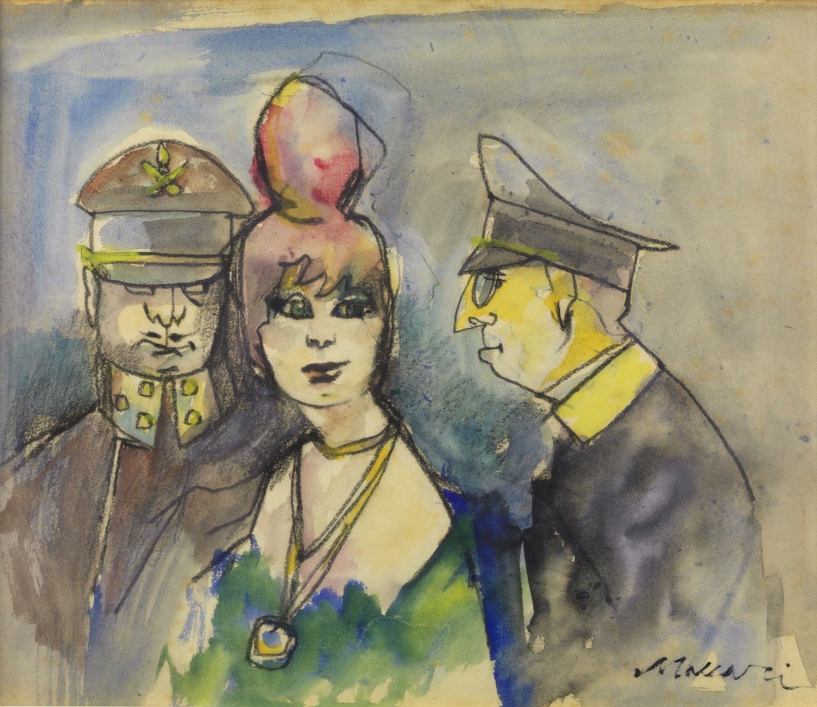 MACCARI MINO (1898 - 1989) Senza titolo. Tecnica mista su carta su tela. Cm 60,00 x 50,00. Firma in basso a destra. Opera archiviata presso l'Archivio Mino Maccari, Cinquale come da documentazione fotografica allegata all'opera riportante il relativo numero d'inventario. Anni'80. Cornice presente