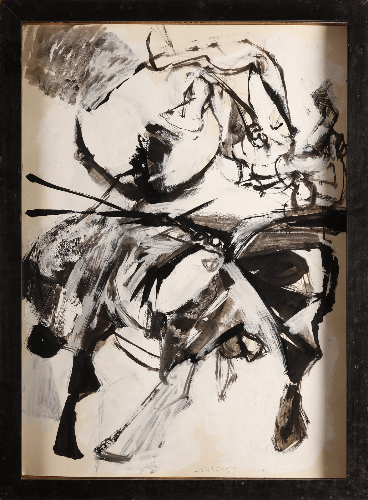 CINTOLI CLAUDIO (1935 - 1978) Corrida. 1959. Tecnica mista su carta. Cm 49,50 x 68,50. Firma e anno in basso al centro. Autentica su fotografia di Vittorio Cintoli. Cornice presente