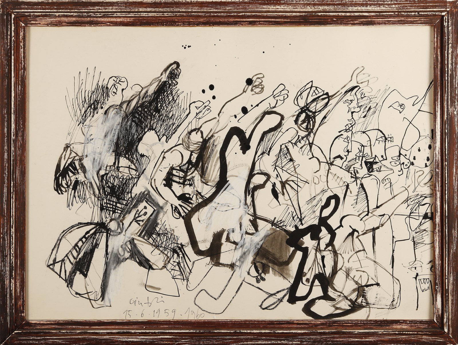 CINTOLI CLAUDIO (1935 - 1978) Schizzi di memoria. 1959. Tecnica mista su carta. Cm 69,00 x 50,00. Firma e anno in basso a sinistra. Al retro titolo e anno. Autentica su fotografia di Vittorio Cintoli. Provenienza: Collezione Vittorio Cintoli. Cornice presente