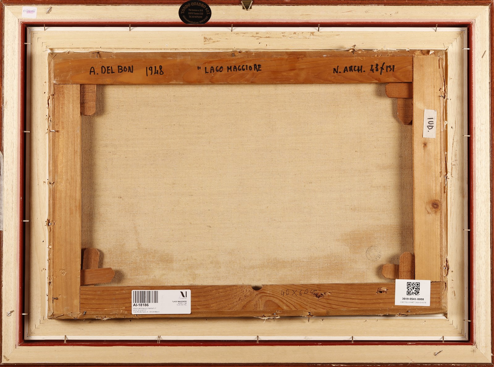 DEL BON ANGELO (1898 - 1952) Lago Maggiore. 1948. Olio su tela . Cm 60,00 x 40,00. Opera archiviata presso l'Archivio Storico e catalogo generale Angelo Del Bon come da documentazione fotografica allegata all'opera riportante il relativo numero d'inventario. Cornice presente