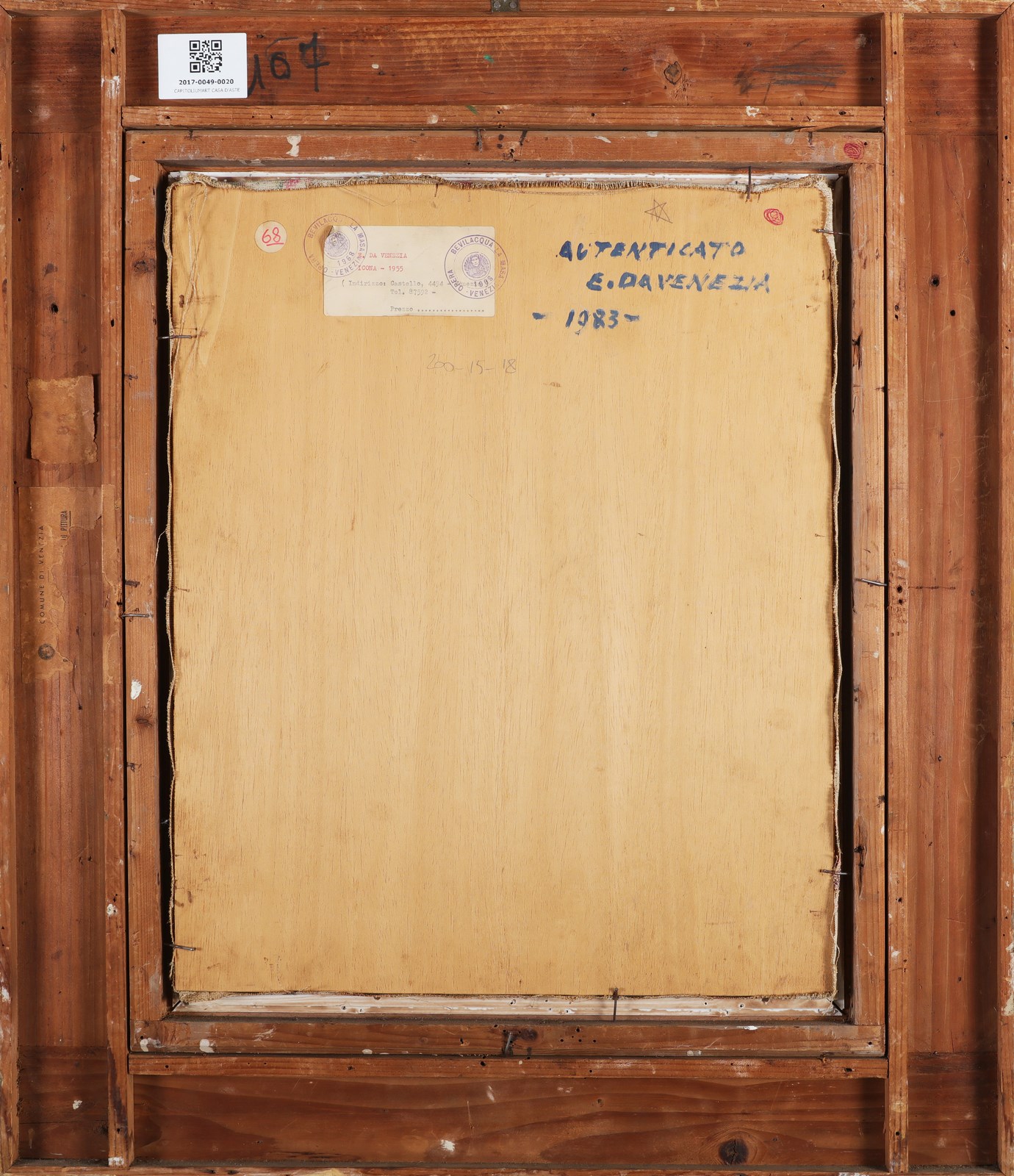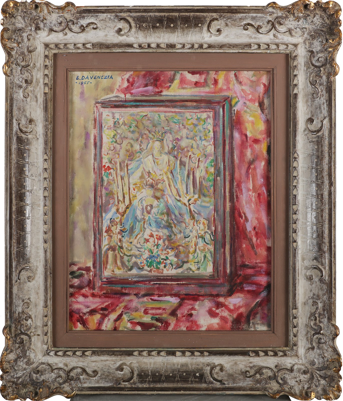 DA VENEZIA EUGENIO (1900 - 1992) Icona. . 1955. Olio su tela . Cm 40,00 x 50,00. Firma e anno in alto a sinistra. Al retro firma per autentica e titolo. Timbro a cura dell'Opera Bevilacqua La Masa, Venezia. Autentica dell'artista su fotografia. Cornice presente