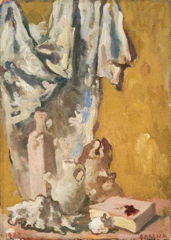 Felice Carena Cumiana (To) 1879 - Venezia 1966 Natura morta, 1963 Olio su tela, cm. 70x49,8 Firma in basso a destra: Carena, data in basso a sinistra: 1963. Al verso sulla tela: firma Donatella Carena: timbro Galleria Medea, Milano; sulla tela e sul telaio: due timbri F.lli Orler Galleria d'Arte, Venezia-Mestre.