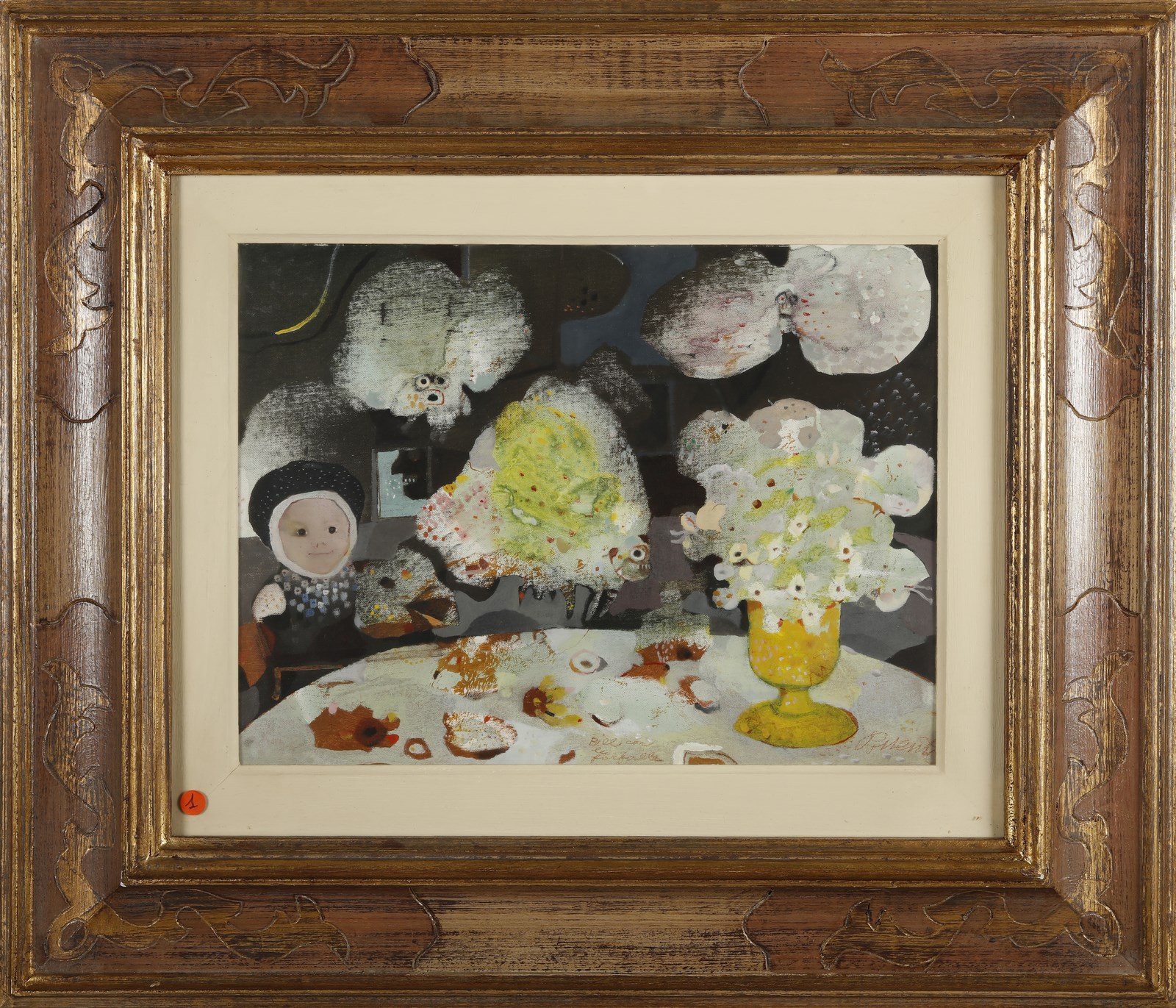 POSSENTI ANTONIO (n. 1933) Bill con le farfalle. Olio su cartone telato. Cm 40,00 x 30,00. Firma e titolo in basso a destra e al retro. . Cornice presente