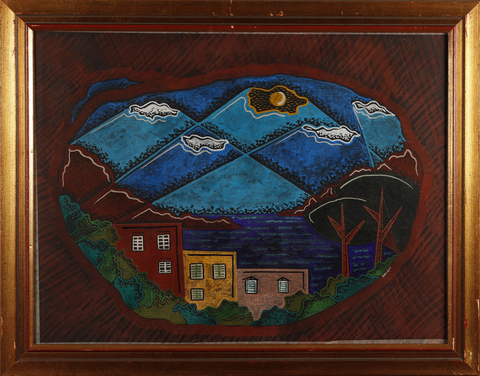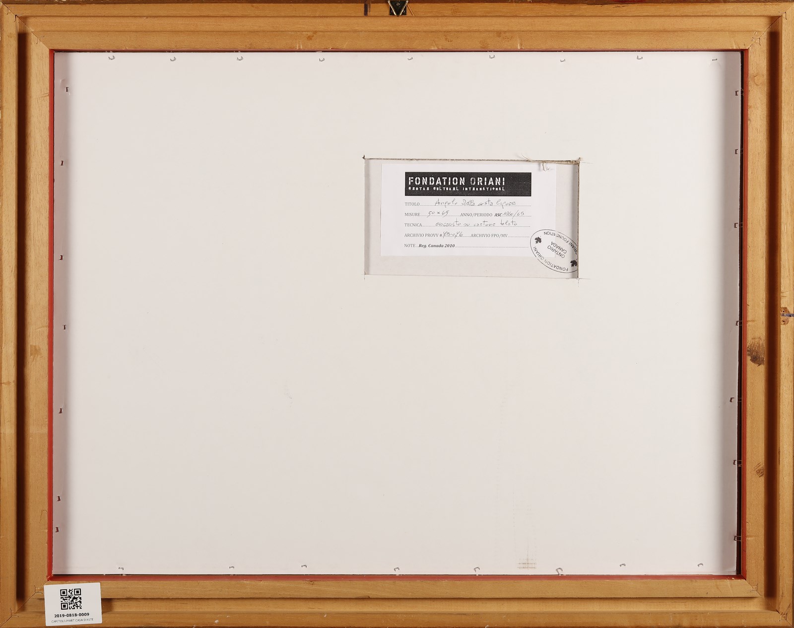 ORIANI PIPPO (1909 - 1972) Angolo della costa ligure. Encausto su cartone telato. Cm 65,00 x 50,00. Firma in basso a destra. Al retro cartiglio descrittivo e timbro della Fondation Oriani, Canada. Opera archiviata presso la Fondation Oriani, Canada come da documentazione fotografica allegata all'opera riportante il relativo numero d'inventario. 1965/1970. Cornice presente