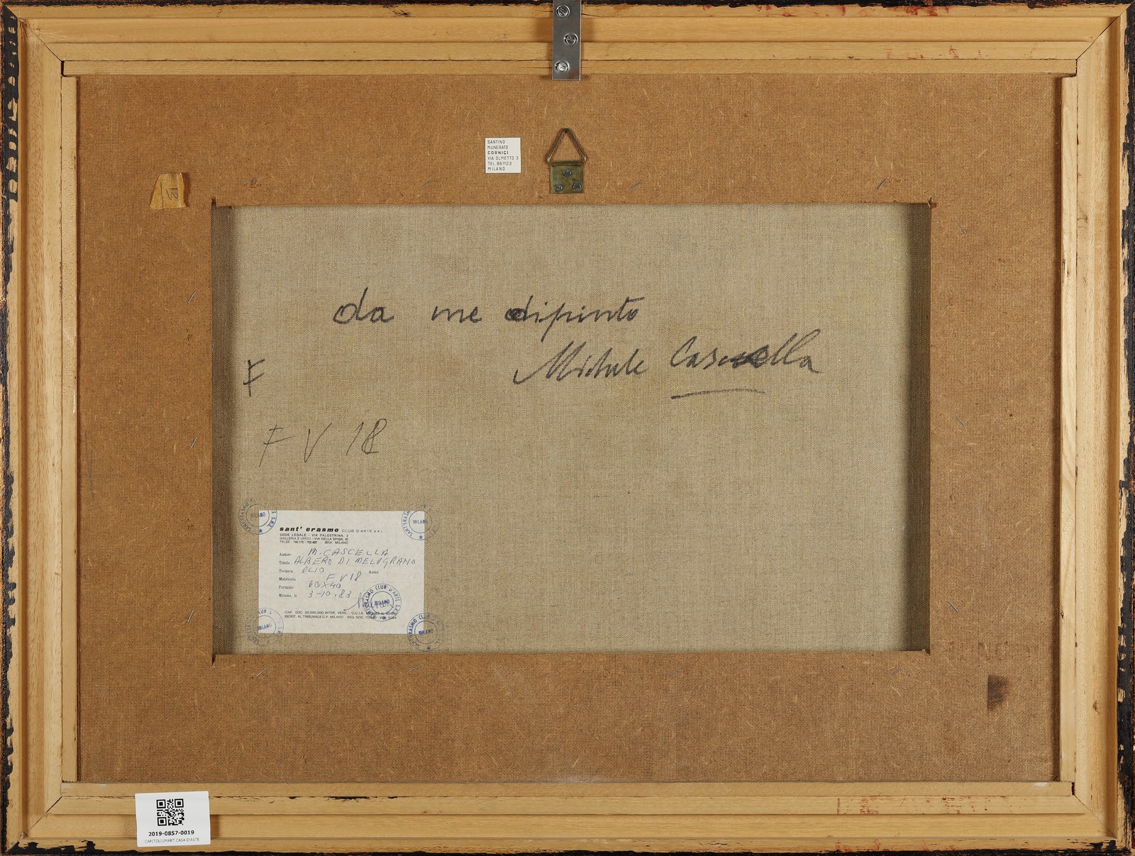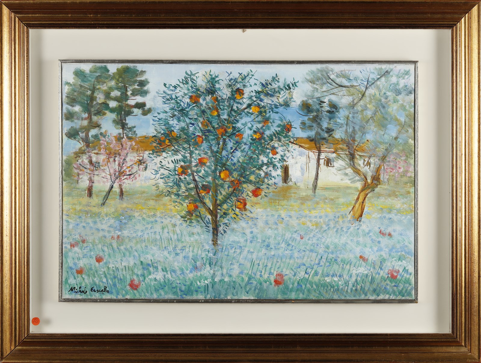 CASCELLA MICHELE (1892 - 1989) Albero di melograno. Olio su tela . Cm 60,00 x 40,00. Firma in basso a sinistra. Al retro firma e cartiglio descrittivo con timbri Galleria Sant'Erasmo. Presenti lievi difetti. Cornice presente