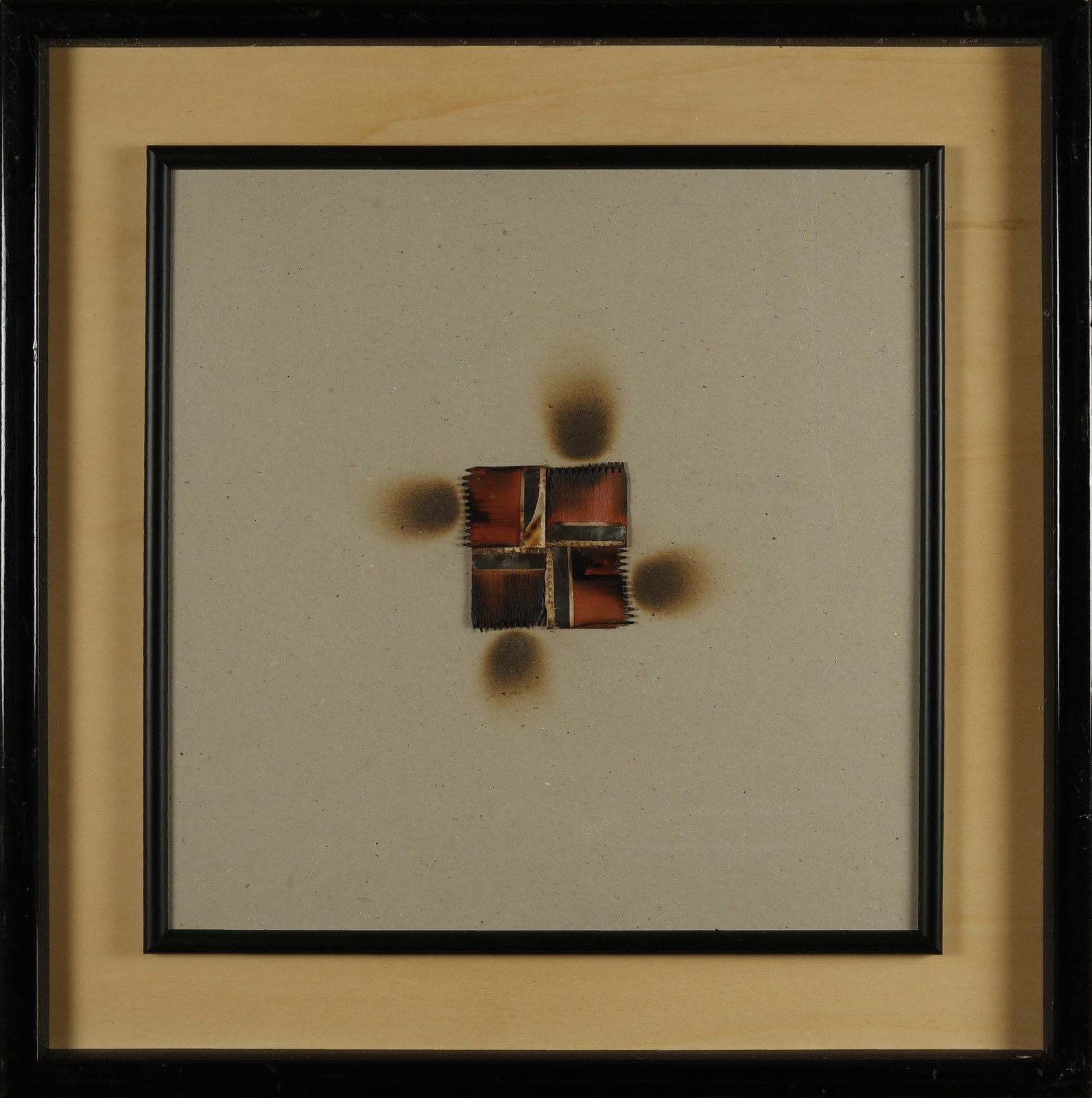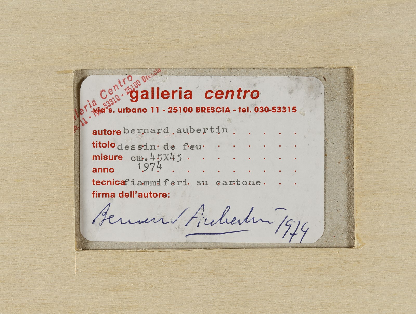 AUBERTIN BERNARD (1934 - 2015) Dessin de Feu. 1974. Fiammiferi bruciati su carta. Cm 45,00 x 45,00. Al retro cartiglio descrittivo Galleria Arte Centro, firma e anno. Opera archiviata presso l'Archivio Bernard Aubertin, Brescia come da documentazione fotografica allegata all'opera riportante il relativo numero d'inventario.