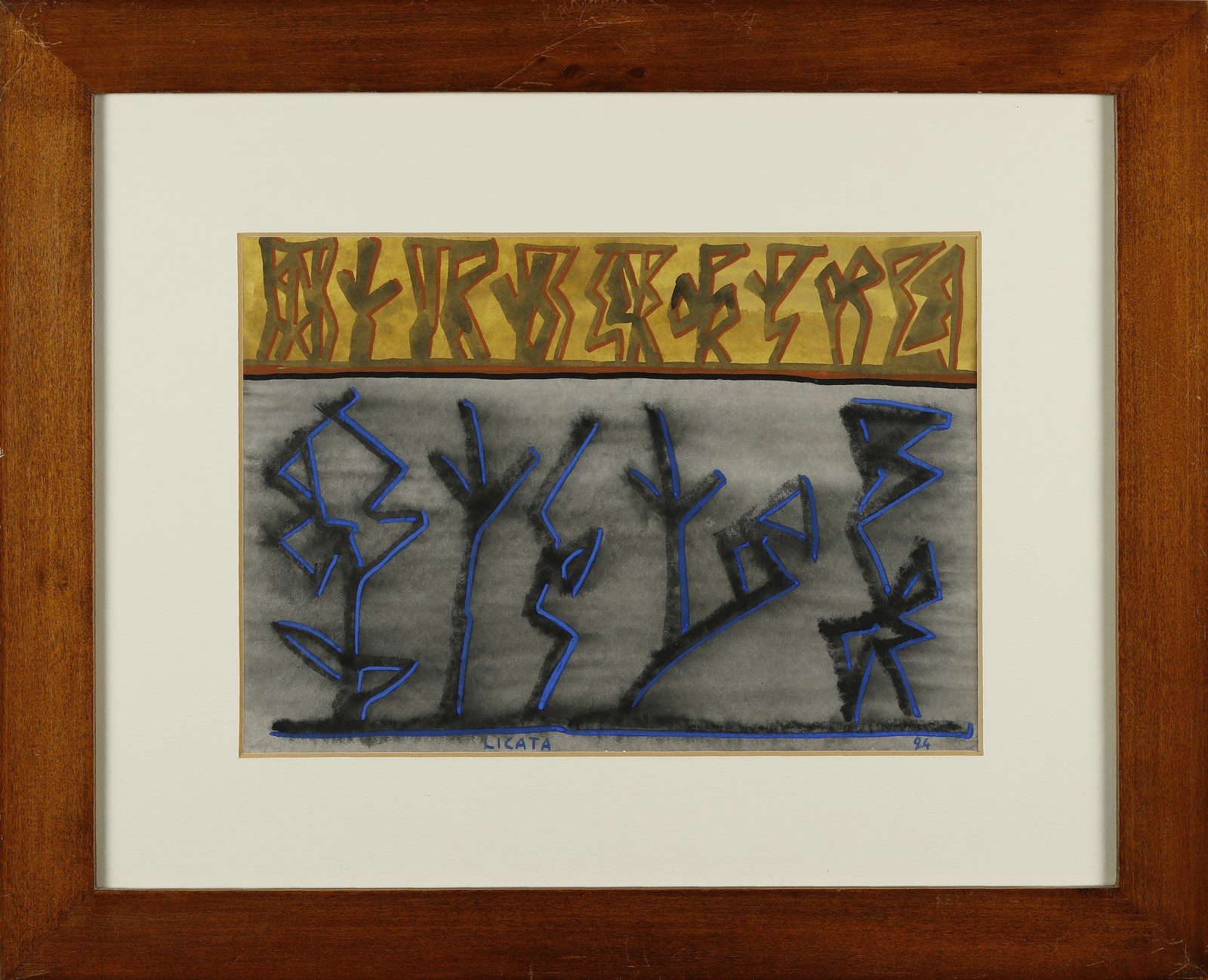 LICATA RICCARDO (1929 - 2014) Senza titolo. 1994. Tecnica mista su cartone. Cm 32,00 x 23,00. Firma in basso a sinistra, anno in basso a destra. Al retro firma e dedica. Autentica dell'artista su fotografia. Cornice presente