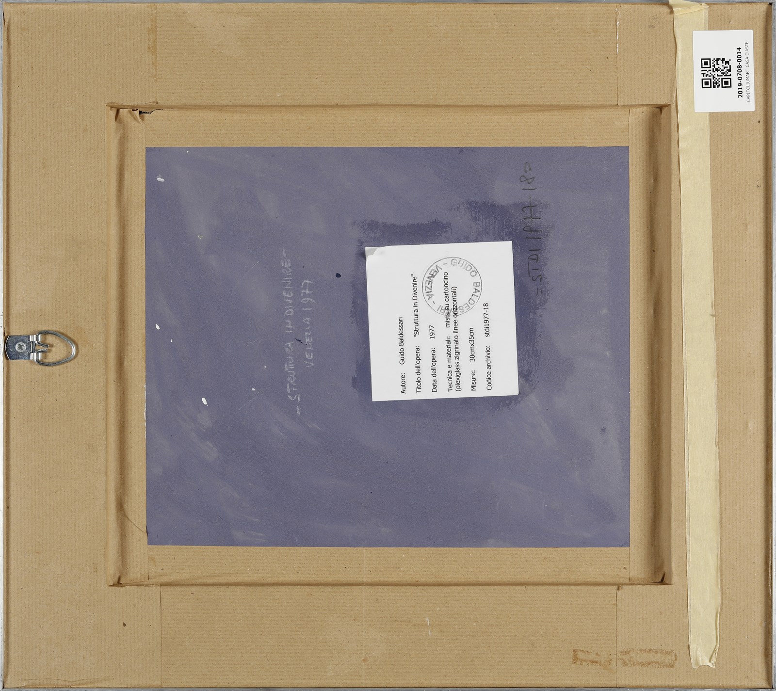BALDESSARI GUIDO (n. 1938) Struttura in divenire. 1977. Tecnica mista su cartoncino. Cm 30,00 x 35,00. Al retro titolo, anno e cartiglio descrittivo dell'artista. Autentica dell'artista su fotografia riportante il relativo numero d'inventario. Cornice presente