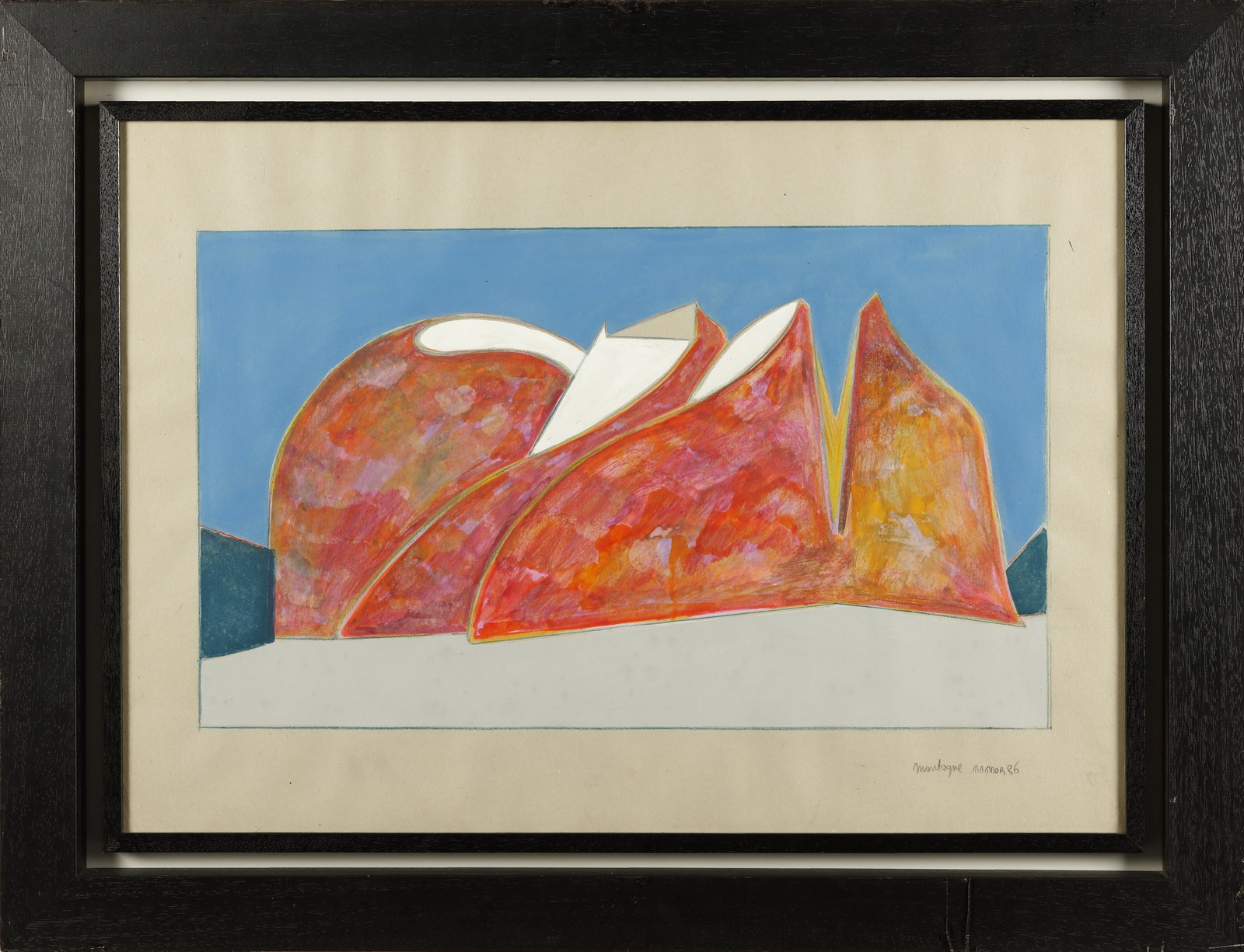 MAMBOR RENATO (n. 1936) Montagne. 1986. Tecnica mista su cartone. Cm 70,00 x 50,00. Firma e anno in basso a destra. Autentica dell'artista su fotografia. Pubblicazione: Mambor trasformatore, a cura di Alberto Dambruso, Maretti Editore, 12 Maggio - 15 Settembre 2017, Venezia, pag. 104. Cornice presente