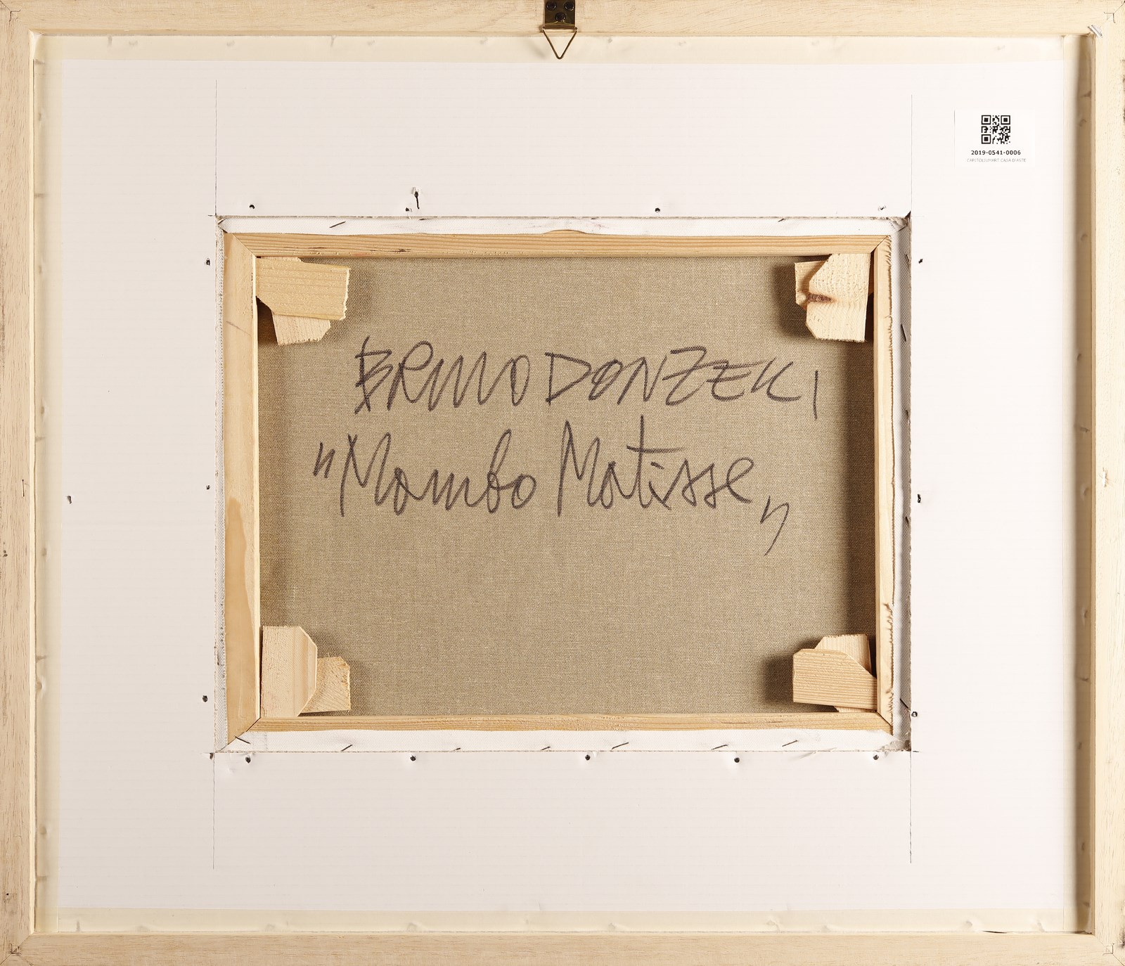 DONZELLI BRUNO (n. 1941) Mambo Matisse. Tecnica mista su tela. Cm 50,00 x 40,00. Firma in basso a destra. Al retro titolo e firma. Autentica dell'artista su fotografia. Cornice presente