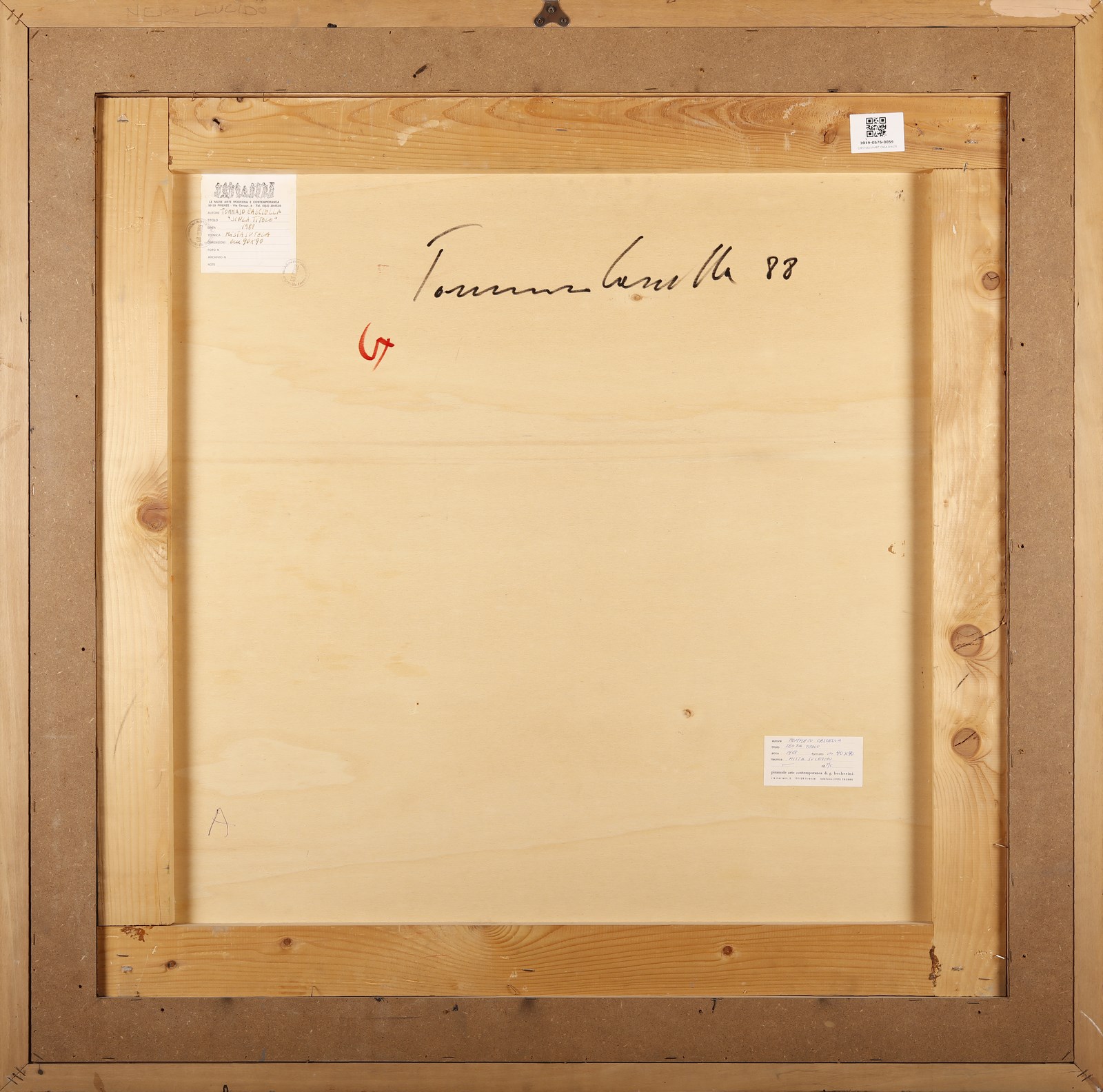 CASCELLA TOMMASO (n. 1951) Senza titolo. 1988. Tecnica mista su tela. Cm 90,00 x 90,00. Al retro firma, anno e cartiglio descrittivo e timbri Le Muse Arte Moderna e Contemporanea, Firenze. Autentica dell'artista su fotografia. Cornice presente