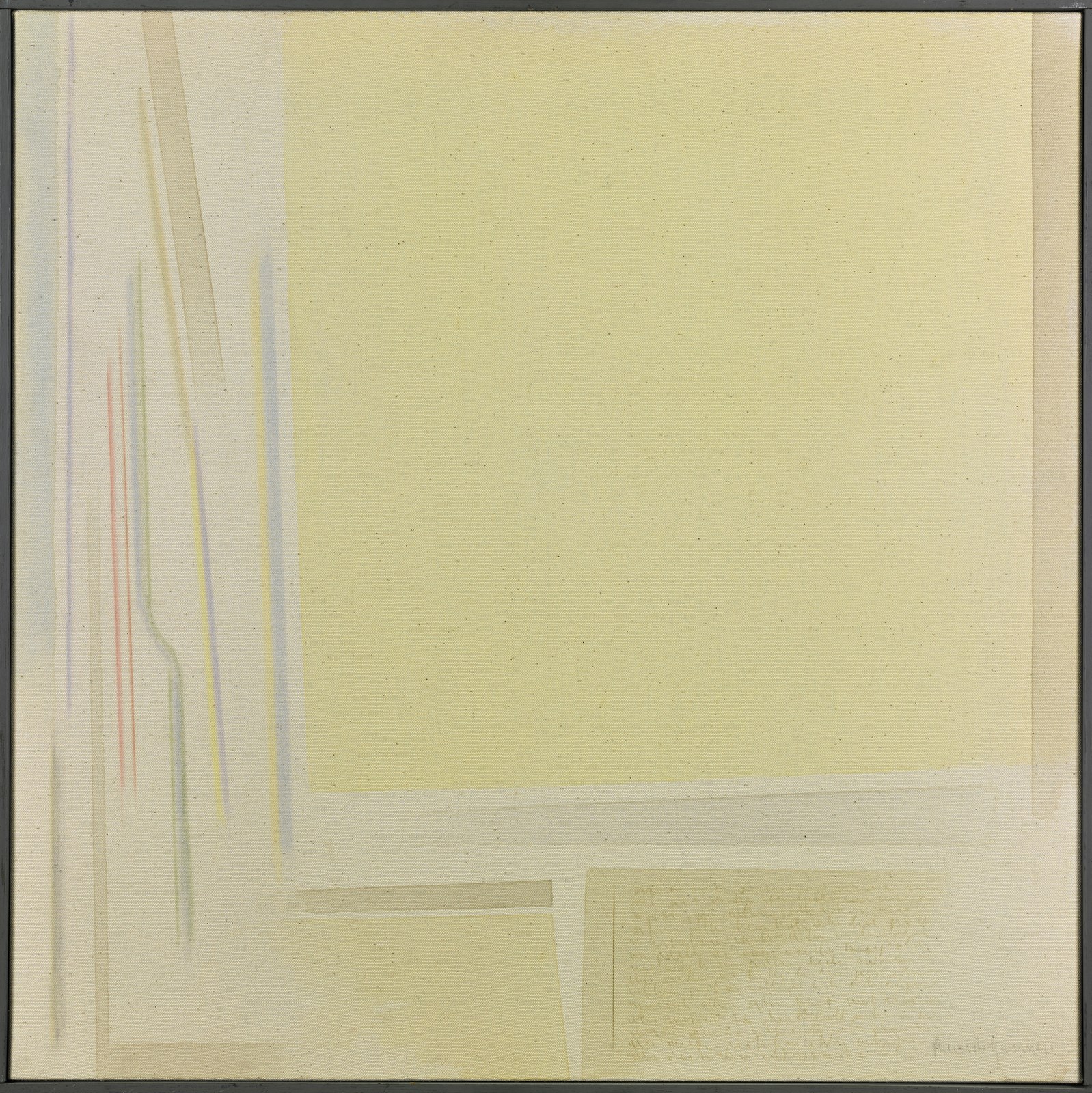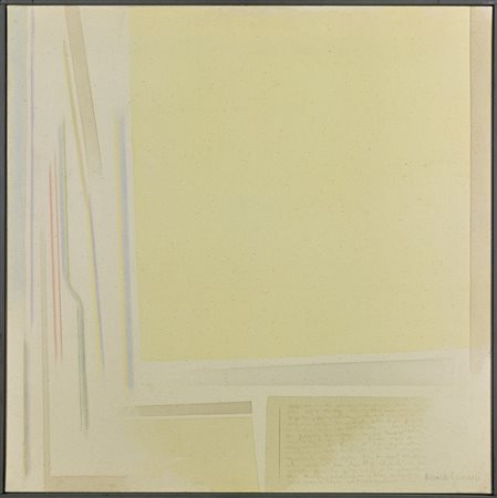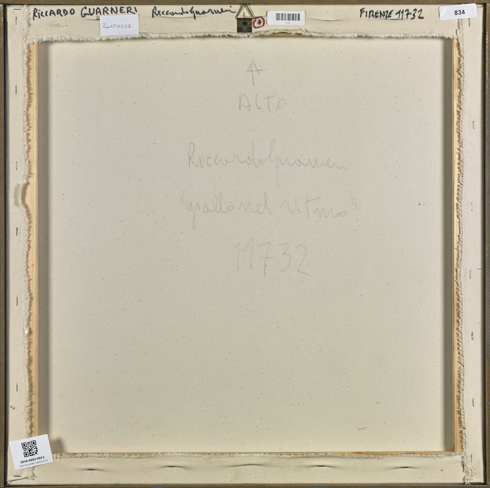 GUARNERI RICCARDO (n. 1933) Giallo nel ritmo. Tecnica mista su tela. Cm 65,00 x 65,00. Firma in basso a destra. Al retro titolo e firma. Autentica dell'artista su fotografia.