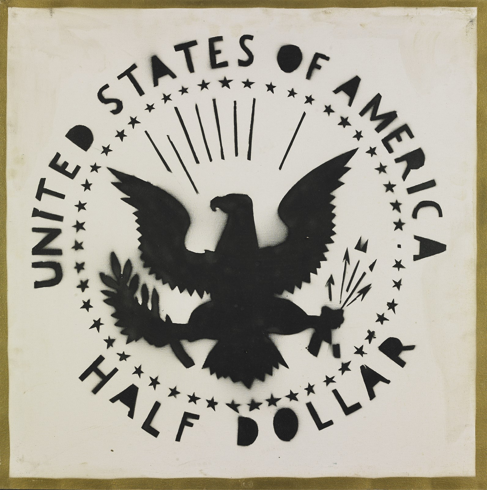 ANGELI FRANCO (1935 - 1988) Half dollar (Antipittura). Spray su tela. Cm 70,00 x 70,00. Firma al retro. Dichiarazione di autenticità Angiolino Calestani. Opera archiviata presso l'Archivio Franco Angeli, Roma come da documentazione fotografica allegata all'opera riportante il relativo numero d'inventario. Cornice presente