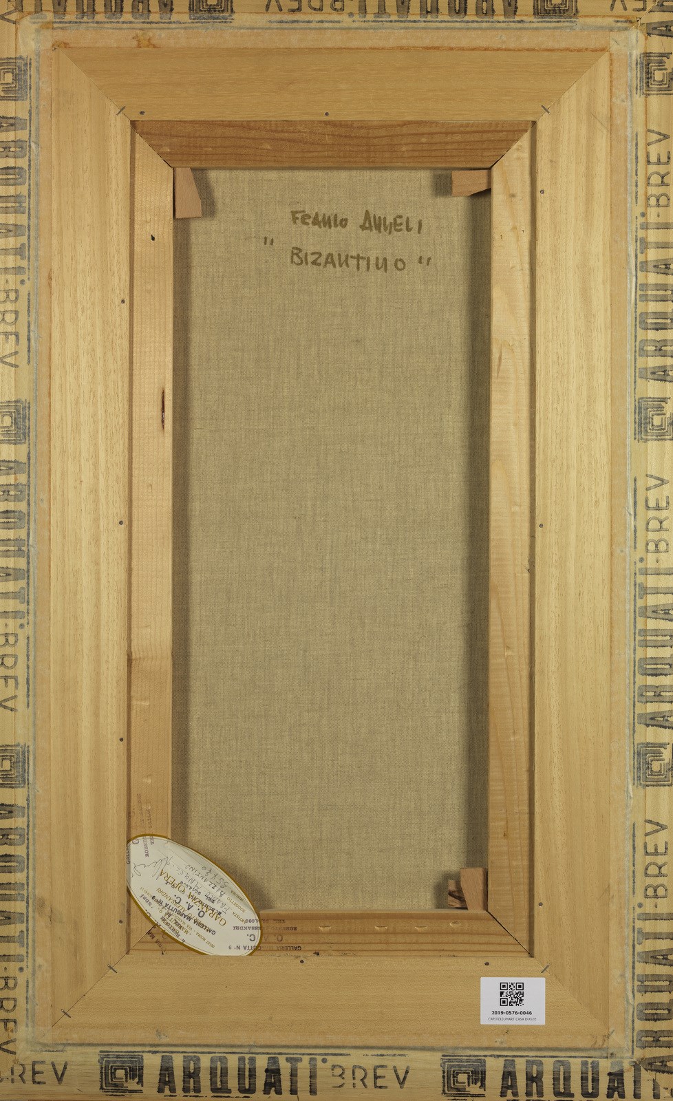 ANGELI FRANCO (1935 - 1988) Bizantino. Tecnica mista su tela. Cm 35,00 x 70,00. Al retro titolo, firma e cartiglio descrittivo Galleria Margutta n.9, Roma. Opera archiviata presso l'Archivio per la Monografia Franco Angeli 10 mercanti ed un'artista a cura di F. Gallo come da documentazione fotografica allegata all'opera riportante il relativo numero d'inventario. Provenienza: Galleria Margutta, Roma. Collezione Vena. Opera archiviata presso l'Archivio Franco Angeli, Roma come da documentazione cartacea allegata all'opera riportante il relativo numero d'inventario. 1987-1988. Cornice presente