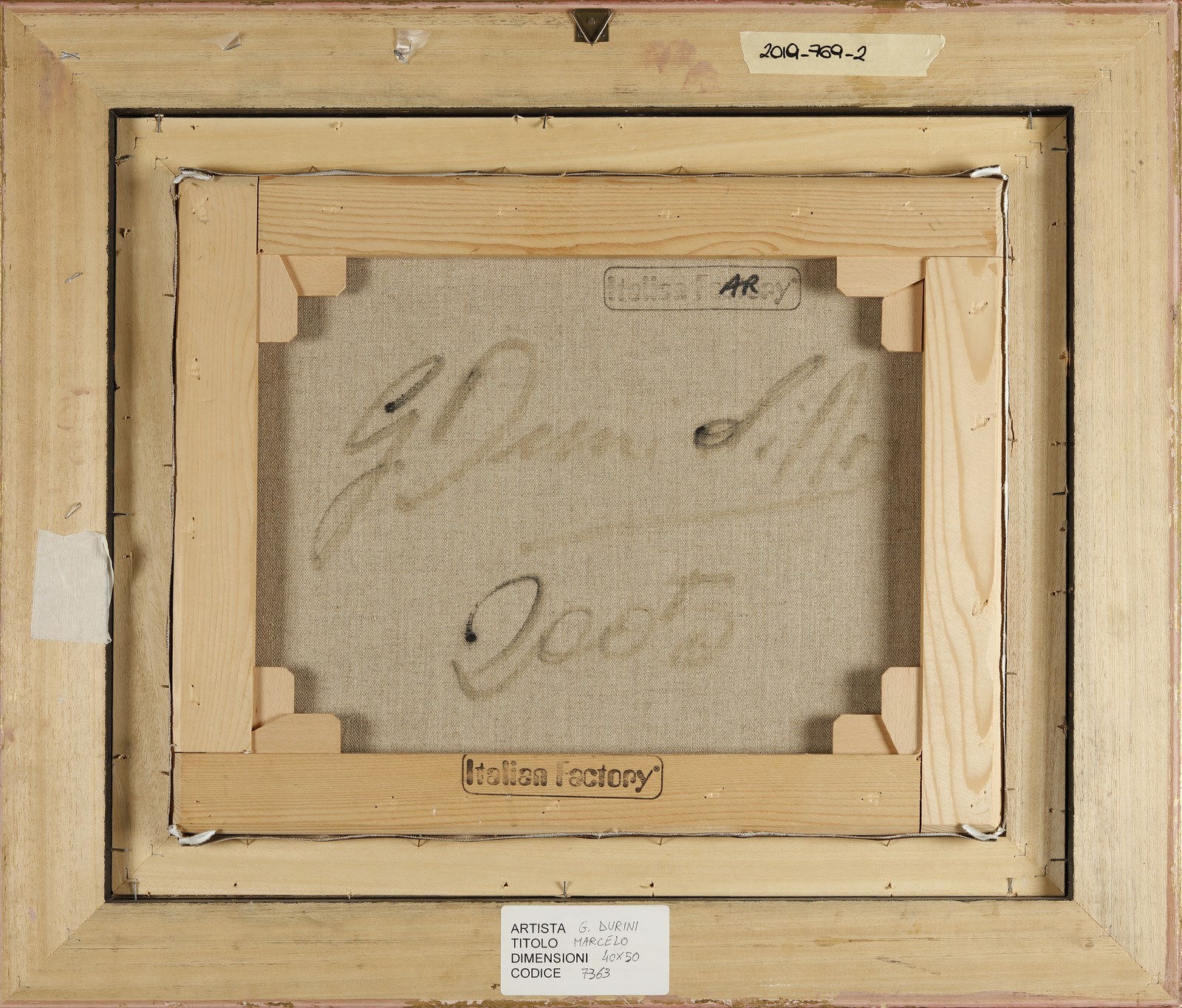DURINI GIULIO (n. 1966) Marcelo. 2005. Olio su tela . Cm 50,00 x 40,00. Al retro firma e anno. Timbro Italian Factory. Autentica dell'artista su fotografia. . Cornice presente