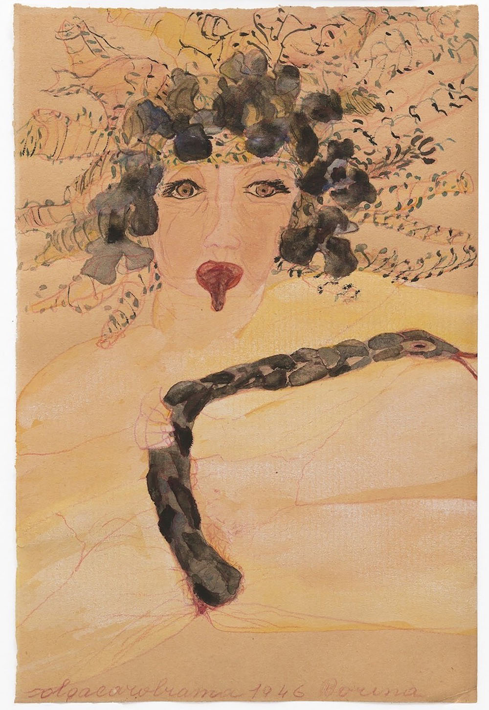 La composizione di questa Dorina, molto più che nelle altre già note della serie, si sviluppa a partire dalla fissità frontale dello sguardo femminile, dove la memoria dei volti ieratici prodotti dalla storia dell’arte antica si sovrappone a uno spleen tutto novecentesco, fatto di perdita della coscienza nelle sensazioni del corpo. In questa versione di Dorina in particolare l’erotismo si ricongiunge con la sacralità. Infatti mai come in questo esemplare i serpente, oltre che immagine del peccato e del desiderio sessuale, torna ad essere attributo iconografico della Pizia, simbolo della capacità di essere abitati dalla sapienza e insieme dalla violenza del dio. Questo serpente, a differenza di altri più stilizzati e resi da Carol Rama con veloci campire, e costruito pittoricamente per scaglie intrecciate, come un animale ctonio dalla pelle scabrosa. L’usuale coroncina floreale che circonda la testa femminile, costituita di esili steli nelle altre variazioni del soggetto, qui si trasforma in una ramificazione che cresce a raggiera dietro le ciocche di capelli neri, che possiedono la leggerezza e l’eleganza di petali. Quei rami su cui cresce a spirale una più sottile vegetazione, come una giovane edera desiderante aggrappata a un tronco non suo, disposti tutto attorno al capo di Dorina, fanno da corona, come i rettili attorno al volto della Gorgone, così che il corpo della donna e il suo sguardo divengono punto di congiungimento tra la vitalità erotica dell’istinto animale e la forza generatrice vegetale in un ciclo di elementi simbolici che si trasformano continuamente l’uno nell’altro.