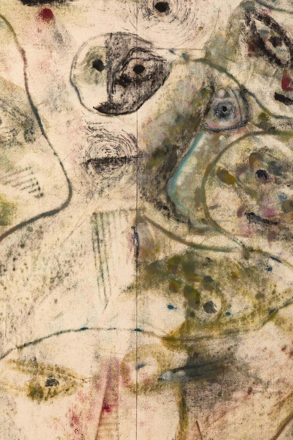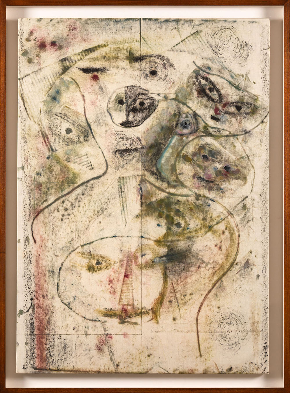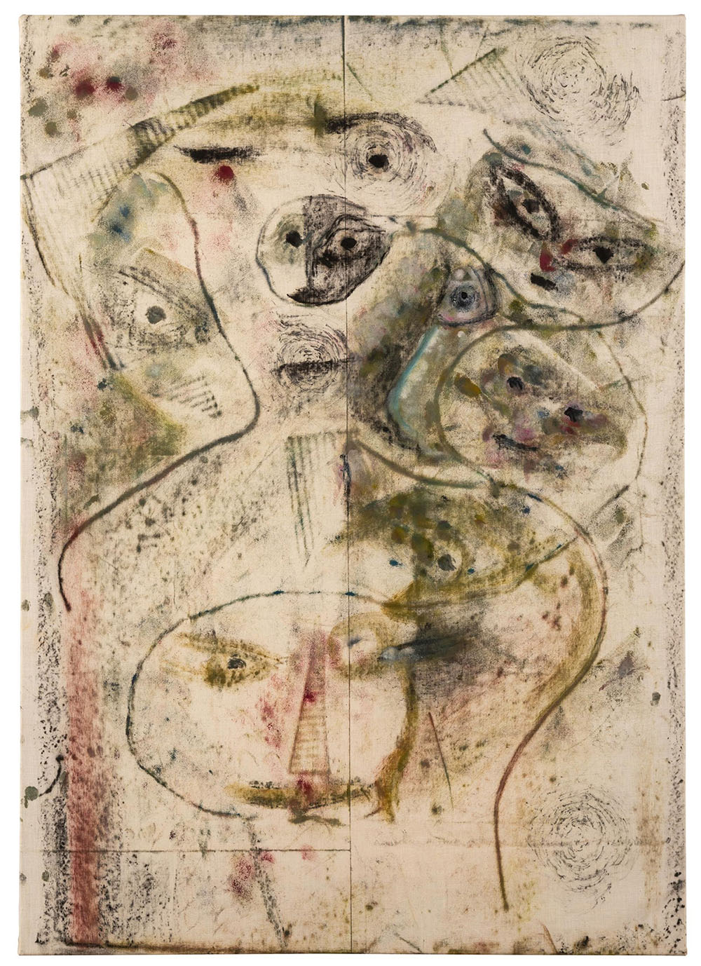Pinot Gallizio (1902-1964) La luna impara a ballare, 1956-1957; inchiostri tipografici, frottage e monotipo su telina industriale, cm 82x58 su tela di cm 100x64,5