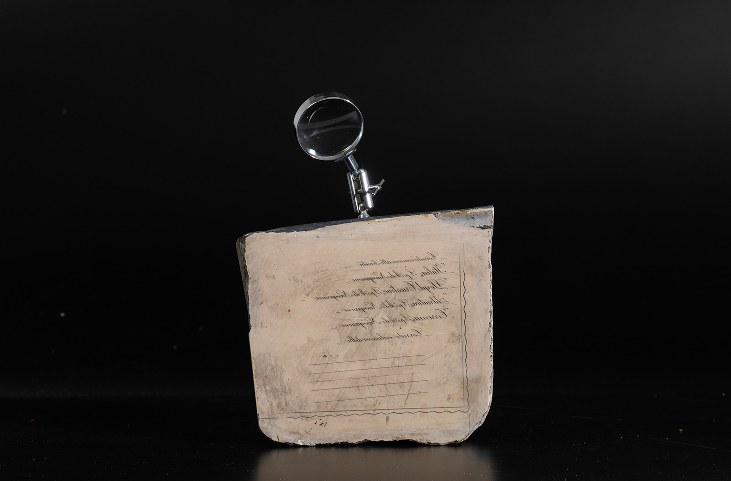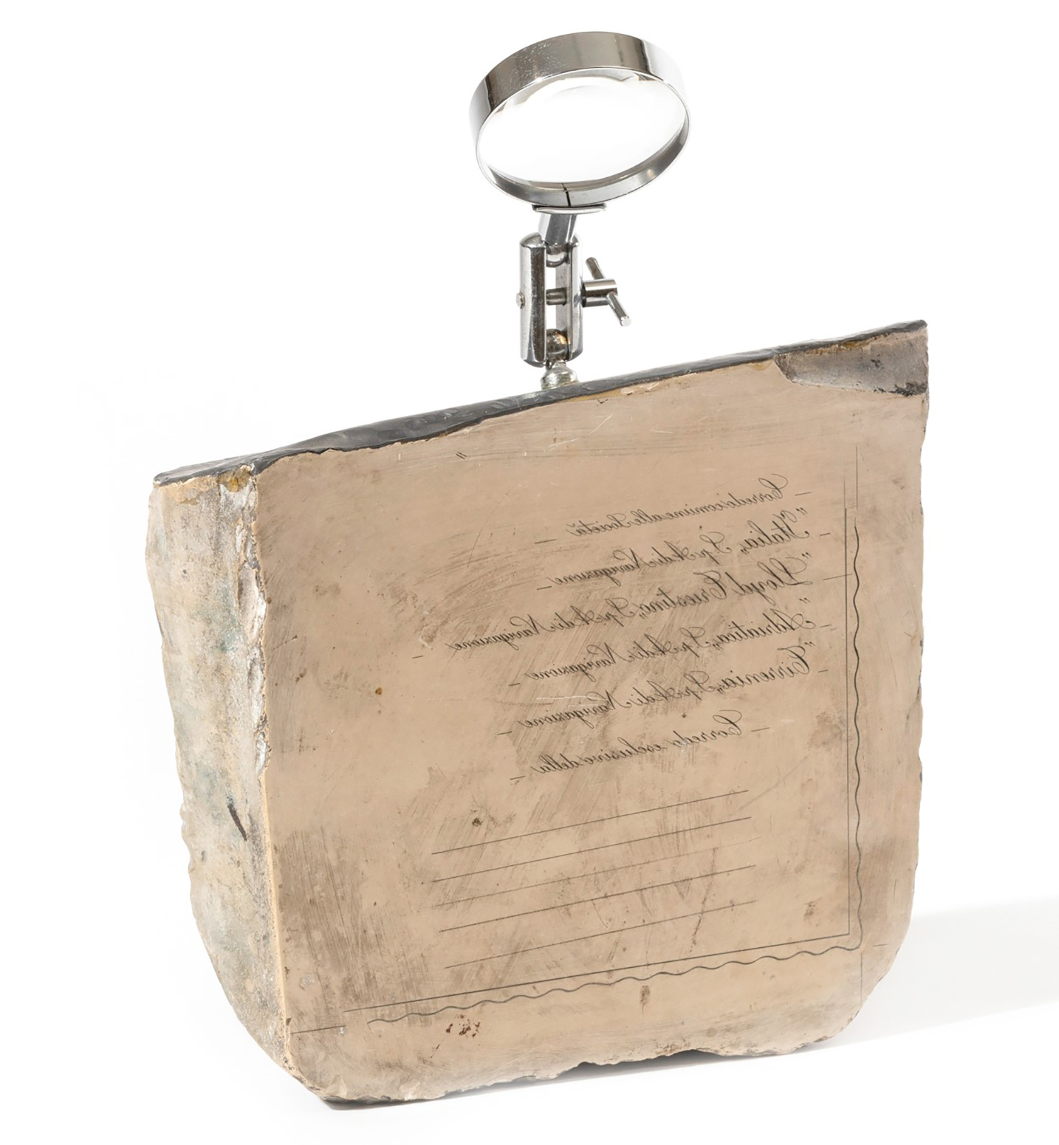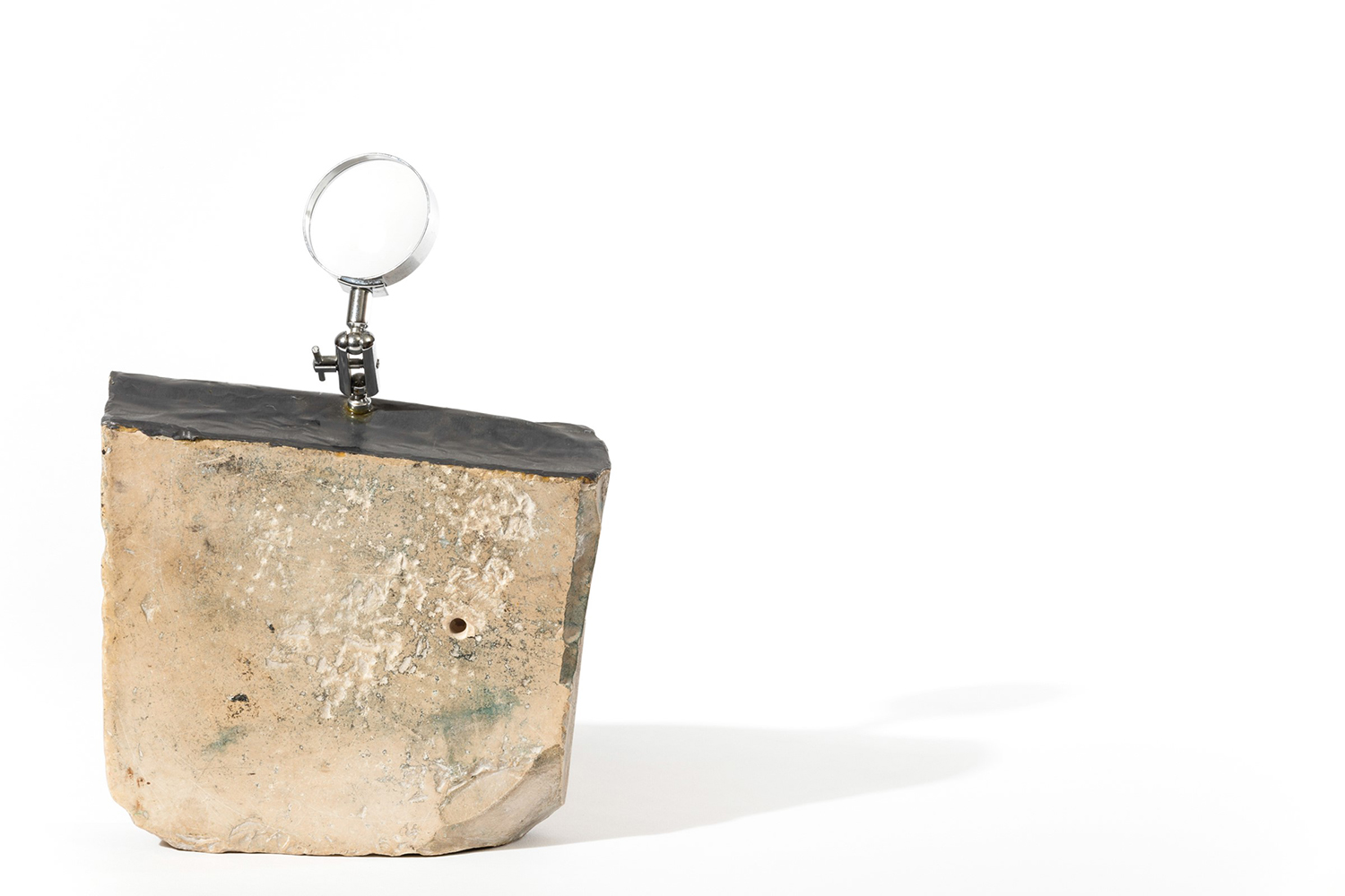 Mauro Ghiglione (1959) Mnemo - Rilevazione ottica, 1999; pietra litografica e lente, cm 27x20x19; Provenienza: