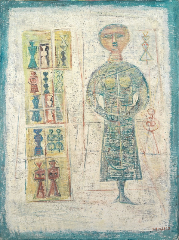Massimo Campigli Berlino 1895 - St.Tropez 1971 Senza titolo, 1960 Olio su tela, cm. 130x96,8 Firma e data in basso a destra: Campigli 60. Al verso sulla tela e sul telaio: sei timbri Raccolta Aldo, Venezia. Storia Collezione Aldo Seno, Venezia; Collezione privata, Milano; Collezione privata Certificato su foto di Nicola Campigli, Saint Tropez 16/05/2011, con n. 556961244.