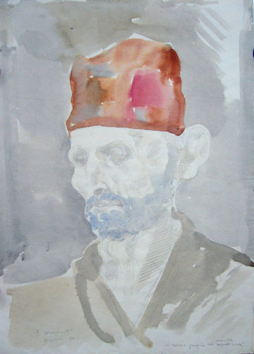 Longaretti Trento "Uomo grigio con berretta rossa "acquarello su carta cm 44 x 32 anno 1984 Firmato e datato in basso a sinistra, titolo in basso a destra, Prov.COLLEZIONE PRIVATA