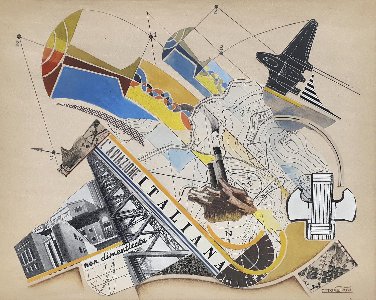 Ettore Tani AEROPITTURA tempera e collage su cartoncino, cm 25x32 firma