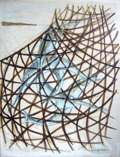 Migneco Giuseppe "rete con pesci" Tempera su carta intelata cm 46 x 60 anni '70 Firmata in basso a destra, Archivio Generale Migneco su foto,Pubblicata II° volume, Prov.COLLEZIONE PRIVATA