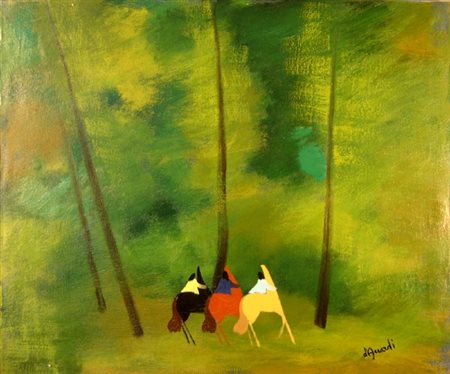 D'accardi Gian Rodolfo " tre cavalieri " olio su tela cm 50 x 60 anni' 70 firma in basso a destra, firma a retro,autenticato su foto dall'artista il 25/10/1978, Prov.COLLEZIONE PRIVATA