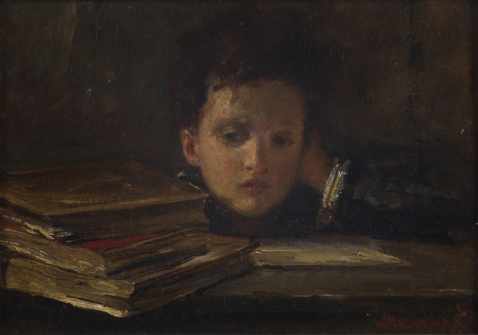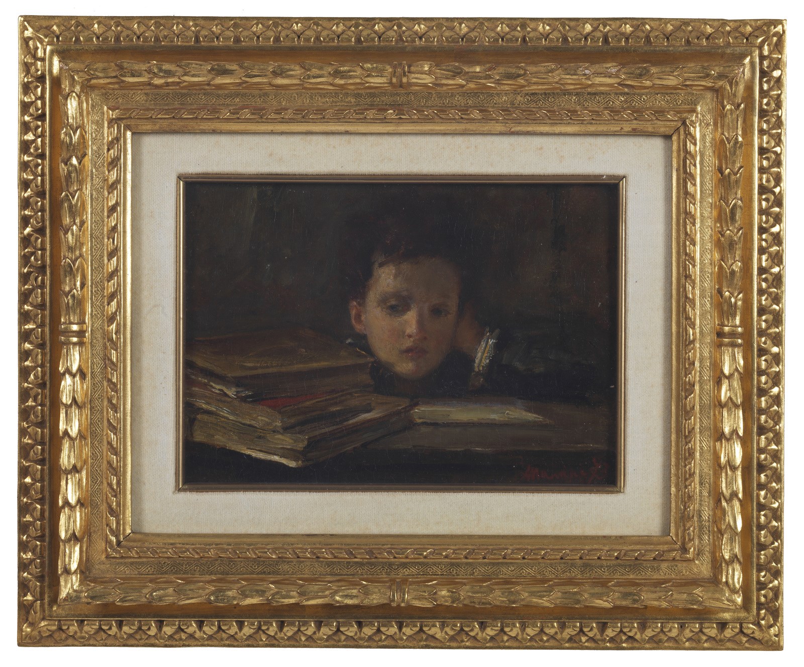 MANCINI ANTONIO (1852 - 1930) Volto di fanciulla. Olio su tavola. Cm 18,00 x 13,00. Firmato e datato 1873 in basso a destra. Al retro dichiarazione di autenticità di Carlo Siviero, 30 marzo 1939. . Cornice presente