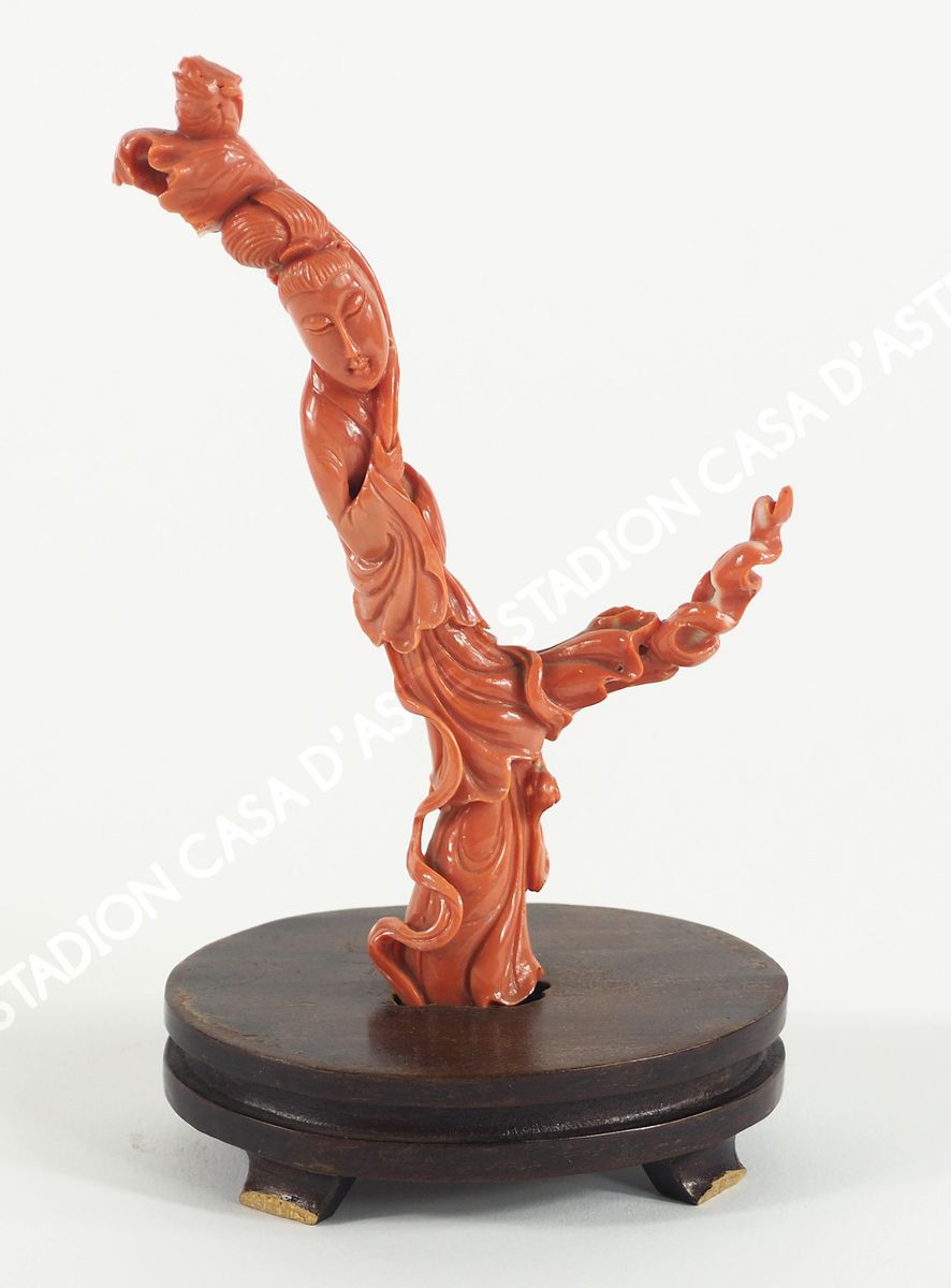 Scultura in corallo lavorato raffigurante personaggio orientale, su base in...