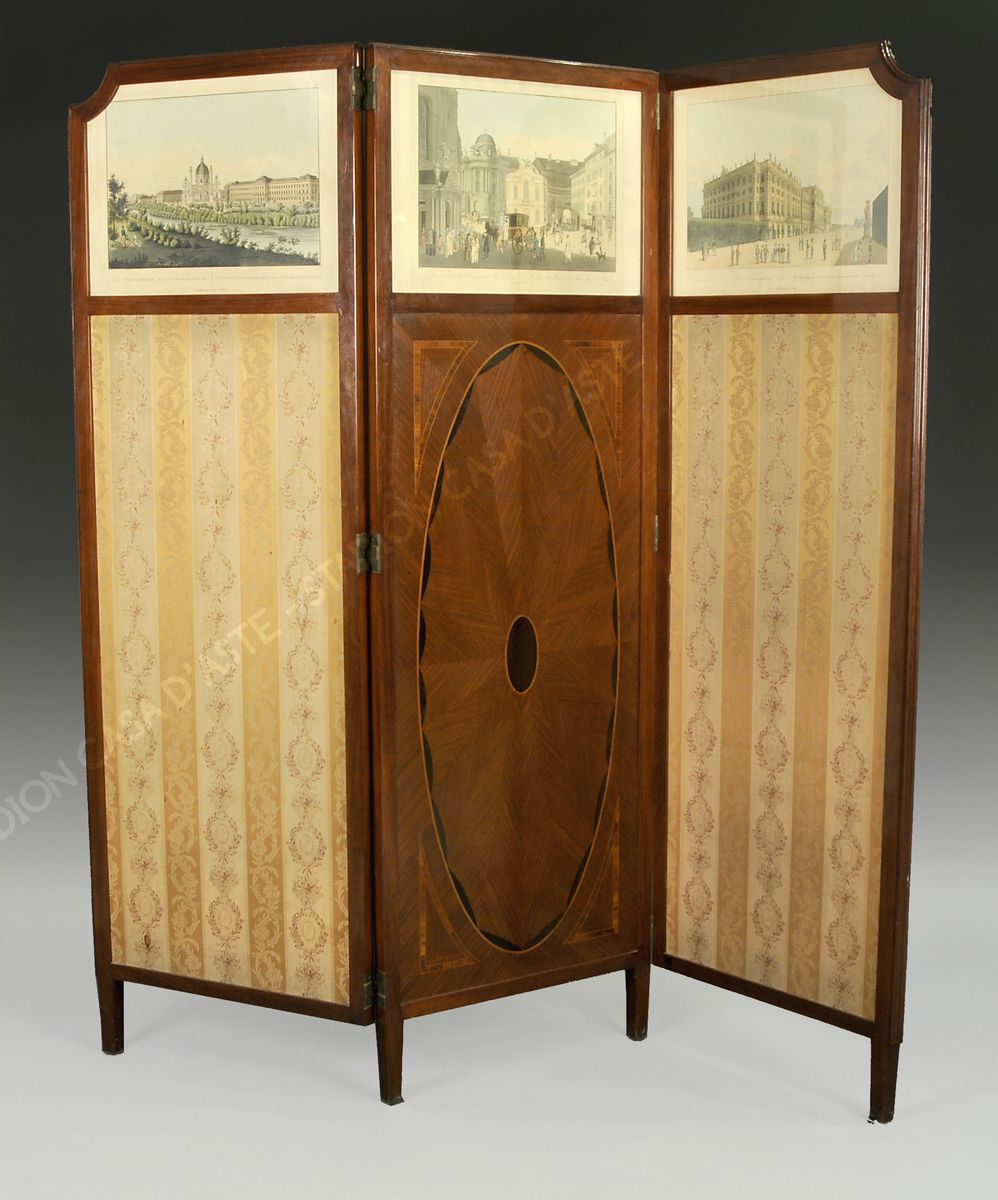 Paravento a 3 ante con struttura in legno, coperto da stoffa e 3 stampe raffiguranti palazzi austriaci. XIX secolo. cm. 167x54 (chiuso).