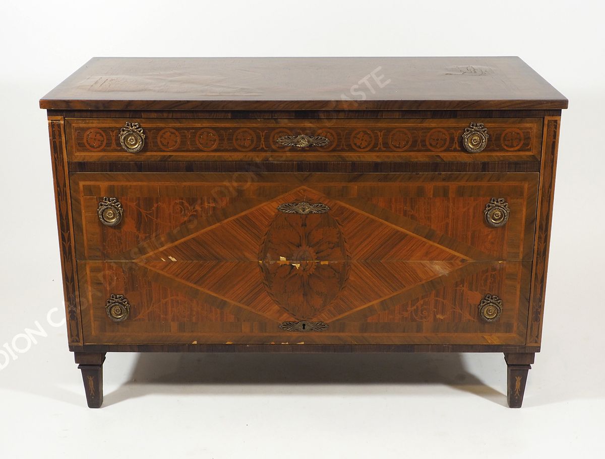 Lotto 15 | Cassettone in legno a 3 cassetti riccamente decorati ad intarsi in legni...