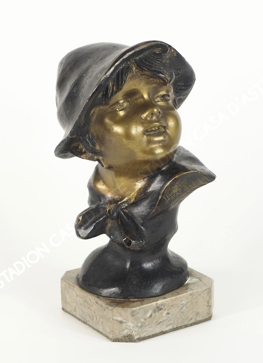 Testina in bronzo a due colori raffigurante scugnizzo, base in marmo. H. tot cm. 26.