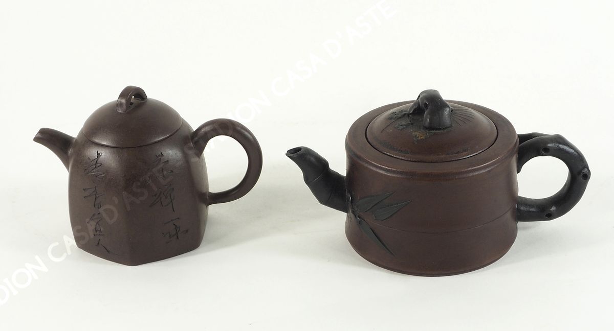 Lotto di 2 teiere in terracotta decorate a motivi orientali, entrambi con manico. Firmate sotto la base.