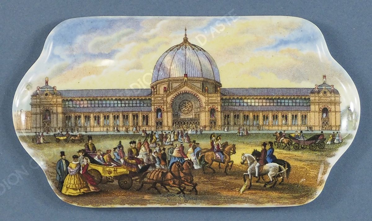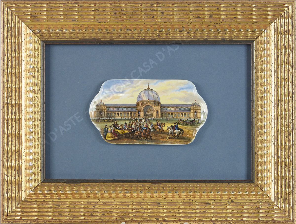 Piccola placca in porcellana dipinta raffigurante Palazzo con carrozze e...