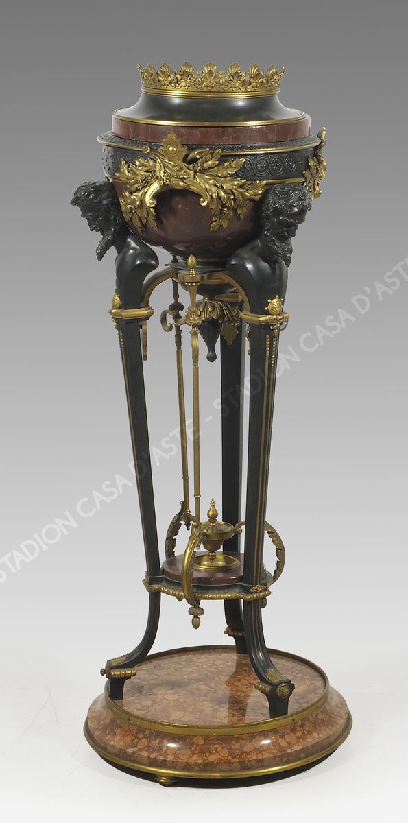 Lotto 165 | Grande bruciaprofumi da terra in ferro lavorato con teste maschili e marmo,...