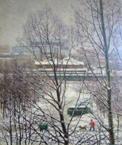 Artista Russo - anonimo " paesaggio imbiancato " olio su cartone cm 41 x 34 anno 1995 Firmato e datato in basso a destra e sul retro, Prov.COLLEZIONE PRIVATA