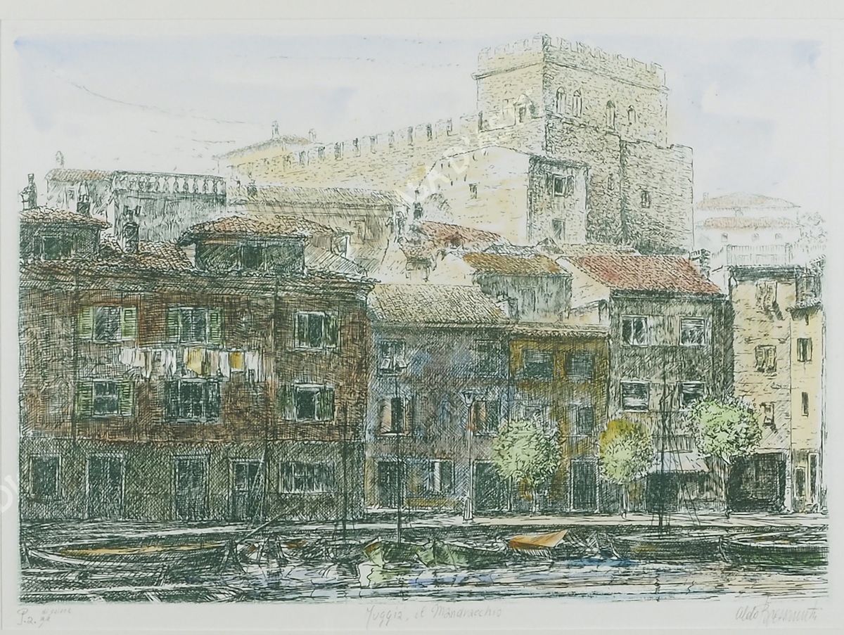Lotto di 2 litografie a colori raffiguranti vedute di Muggia. Entrambe firmate.