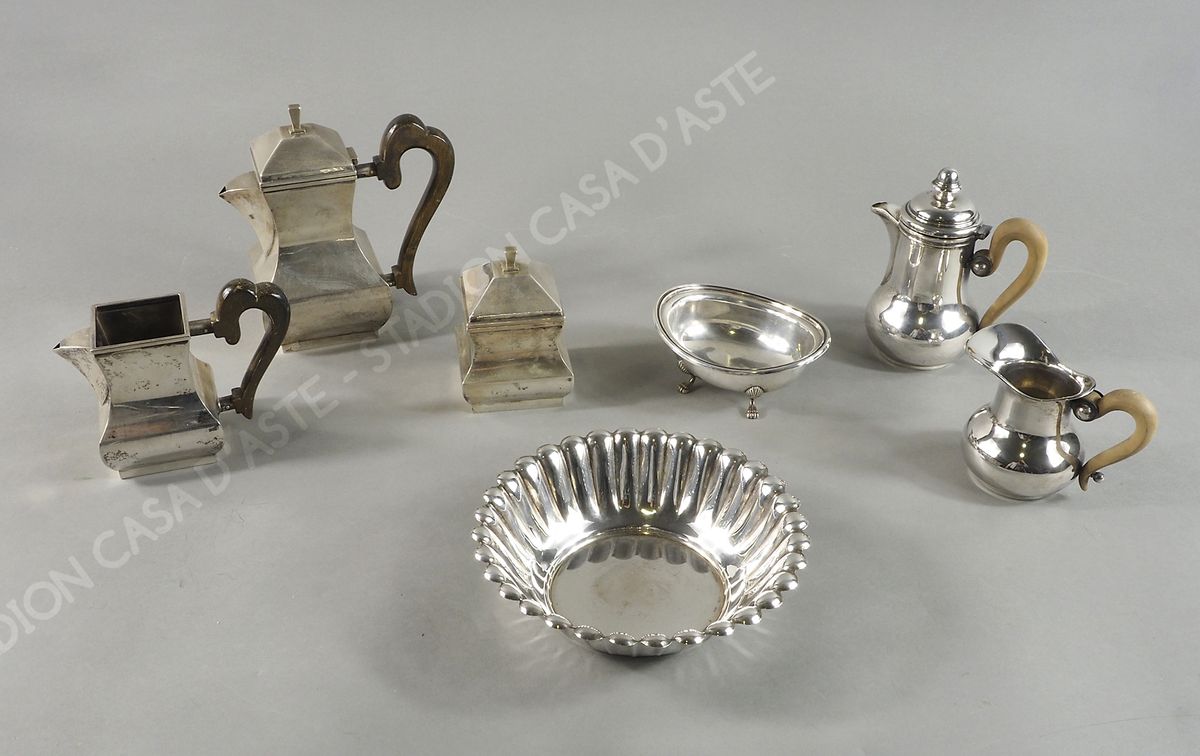 Lotto di 7 oggetti in argento tra cui 2 servizi da caffè con manici in legno. gr. tot 1220.