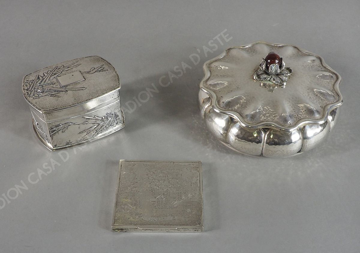 Lotto di 3 scatolette in argento lavorate, una incisa raffigurante veduta di...