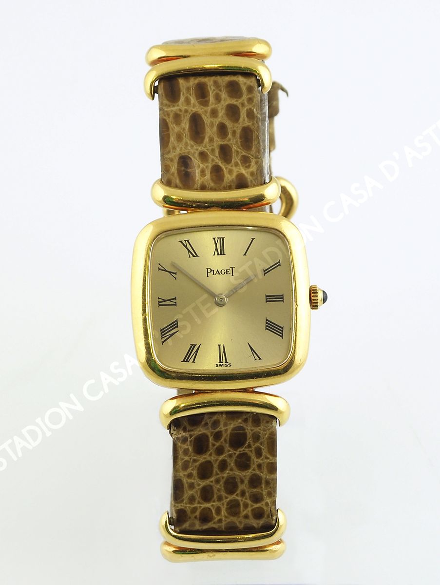 Piaget: orologio da polso da donna con cassa quadrata in oro giallo, quadrante con numeri romani.