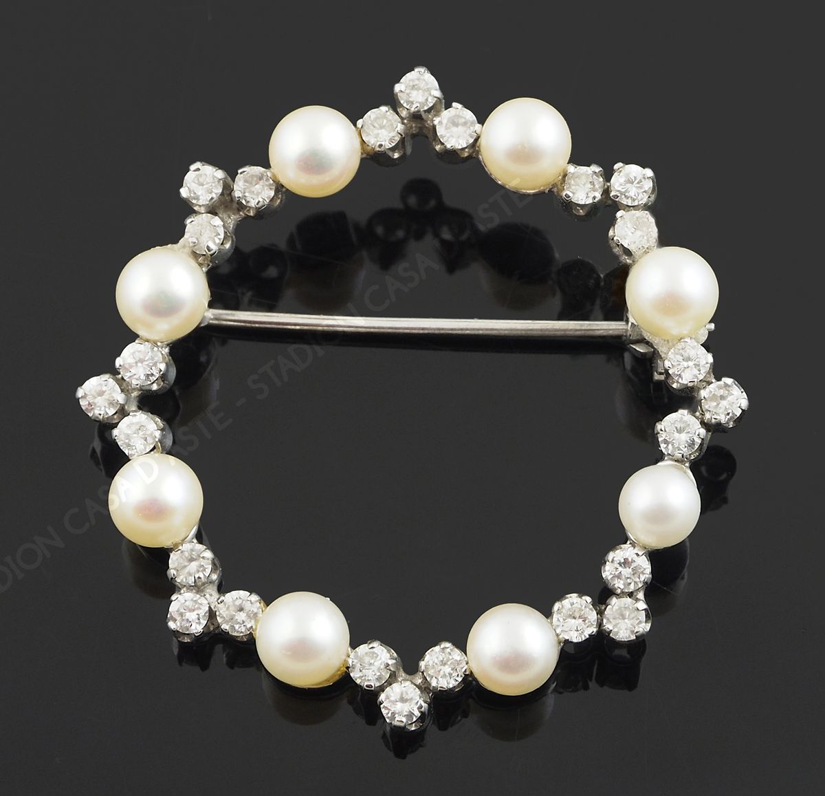 Spilla rotonda in oro bianco composta da diamantini taglio brillante e perline.diam cm 3