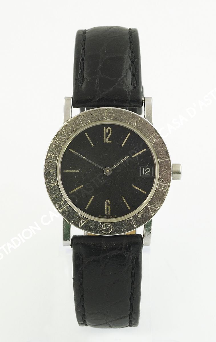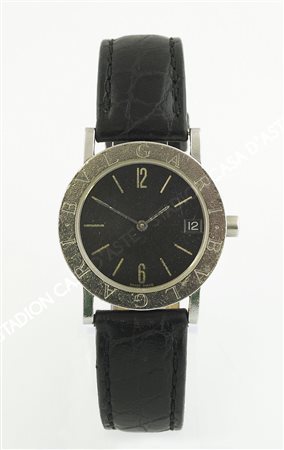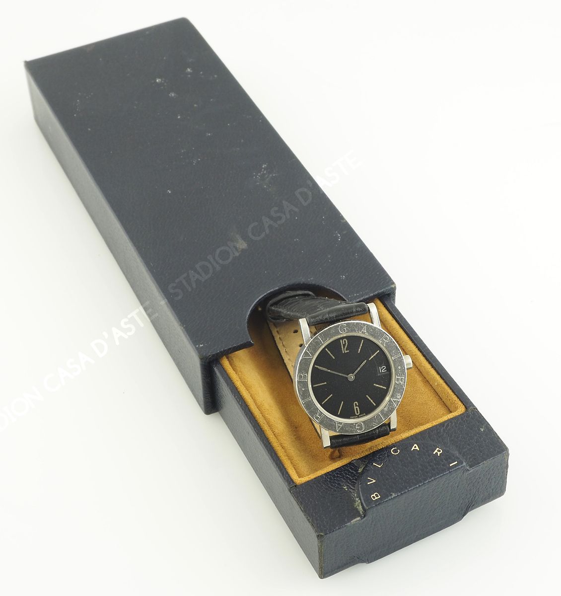 Bvlgari: orologio da polso con cassa rotonda in acciaio, quadrante nero con datario a ore tre. Con scatola originale. Al quarzo.