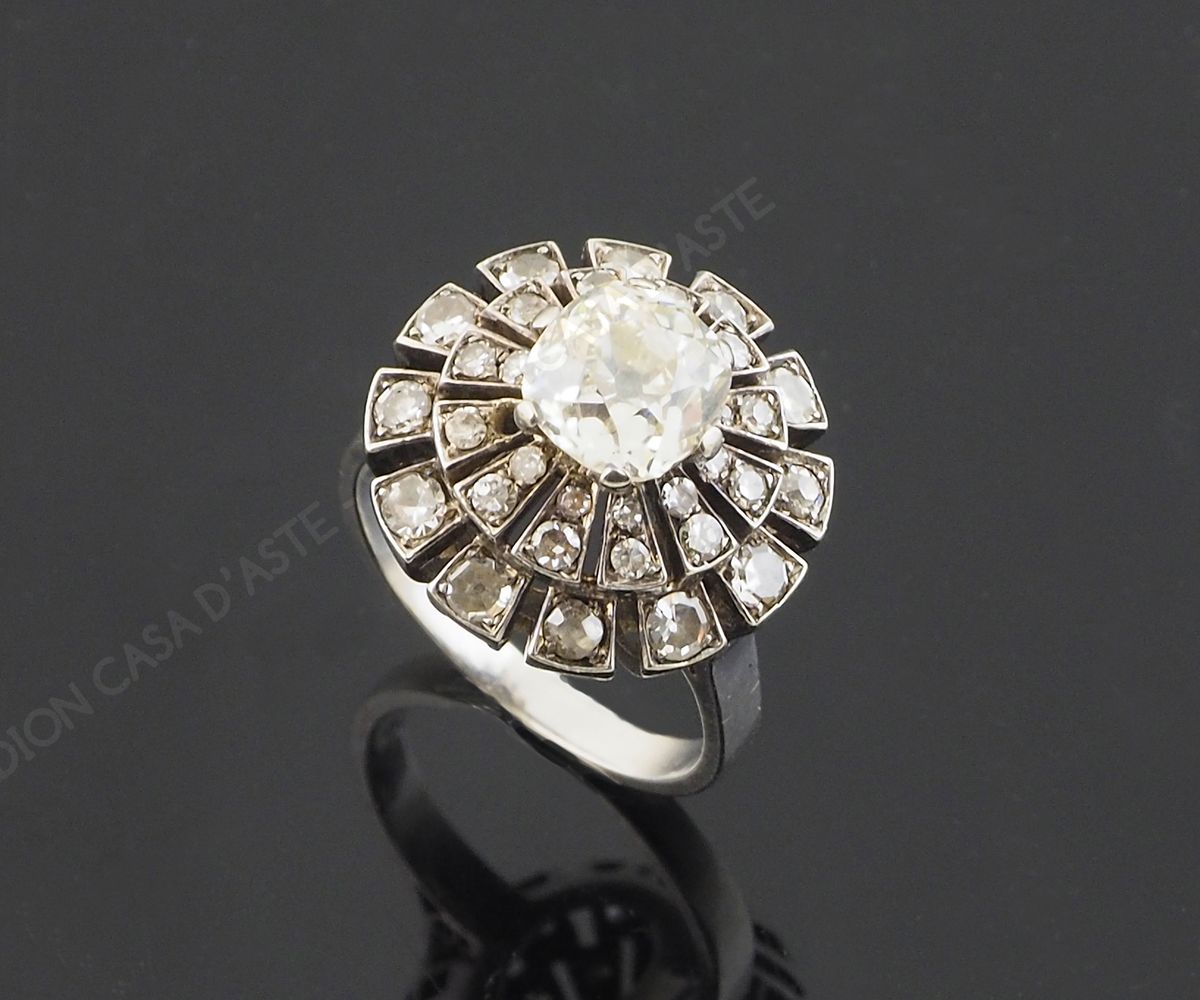 Anello in oro bianco con diamante taglio vecchio puro di 1,10 ct circa contornato da altri diamanti per 0,80 ct circa. gr. 5,57. (mancanza).