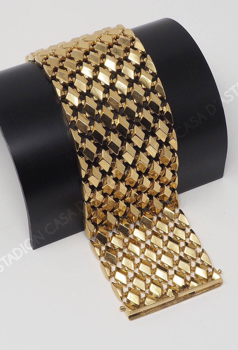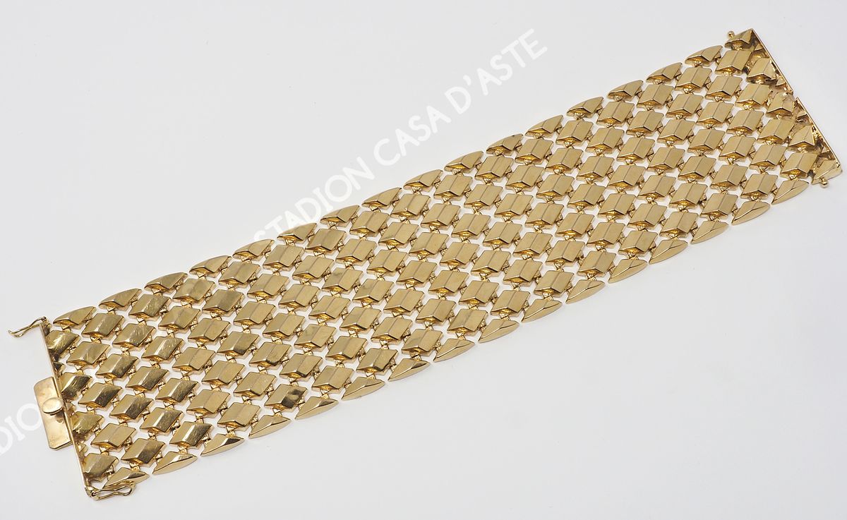 Bracciale a fascia larga in oro giallo, gr 83. Con scatola Iviani Trieste.