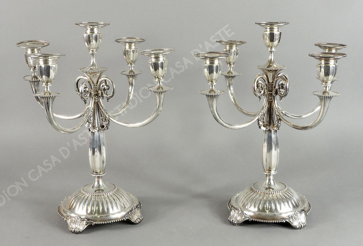 Tiffany: paio di candelabri in argento a 5 fiamme, base rotonda su 4 piedini a forma di foglie, tronco sagomato a coste verticali e motivi vegetali. Punzonati. H. cm. 40. gr. 3400.