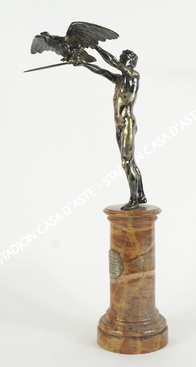 Scultura in argento raffigurante personaggio con aquila, su base cilindrica...
