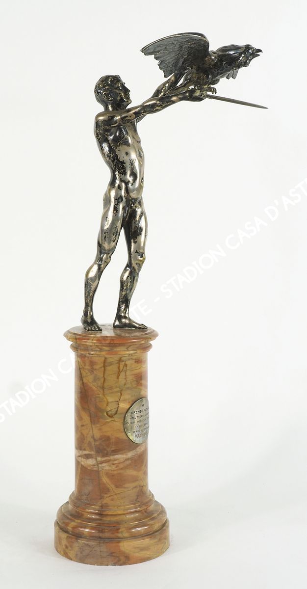 Scultura in argento raffigurante personaggio con aquila, su base cilindrica in marmo. H. tot cm. 53.