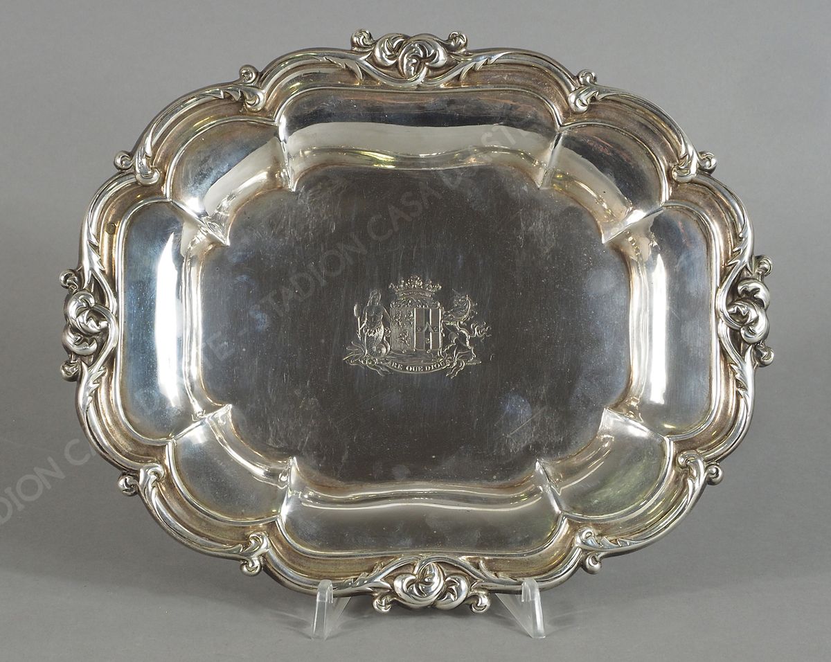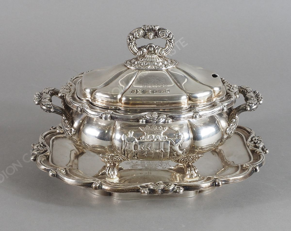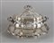 Odiot Paris: salsiera in argento con coperchio e vassoio, sbalzi a motivi floreali e stemma nobiliare (lo stesso inciso sul coperchio e sul vassoio). Punzonata. cm. 18x26. gr. 1930.