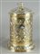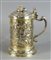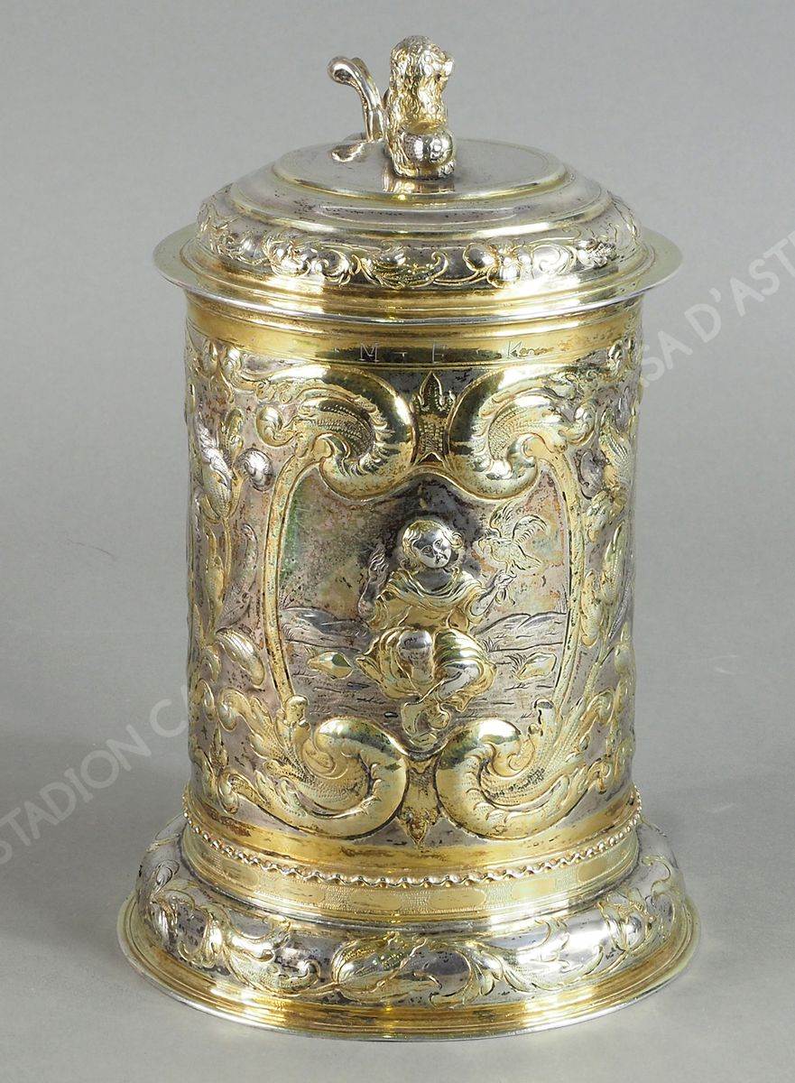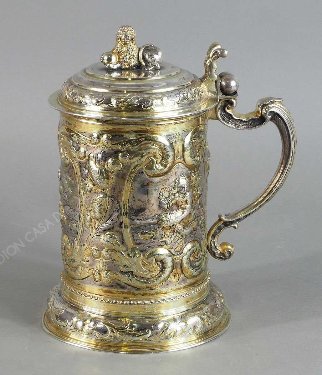 Tankard in argento sbalzato e cesellato con decori floreali e a volute su tre medaglioni raffiguranti scene con bambini, segni di doratura, sul coperchio una figura di leone. Interno dorato. Nord Europa, XVIII secolo. H. cm. 26. gr. 1250.